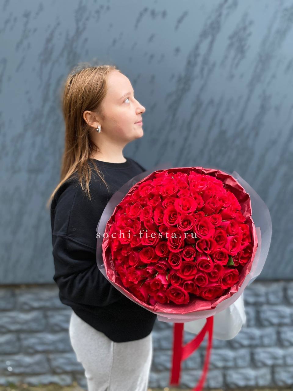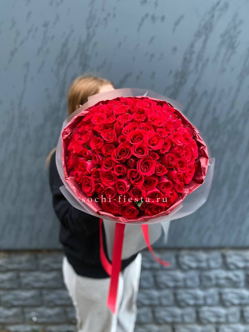 Монобукет из ста одной розы выстроен вертикальными линиями стеблей и плотной шапкой бутонов. Чистый красный цвет без примесей. Формат для по-настоящему значимых событий.