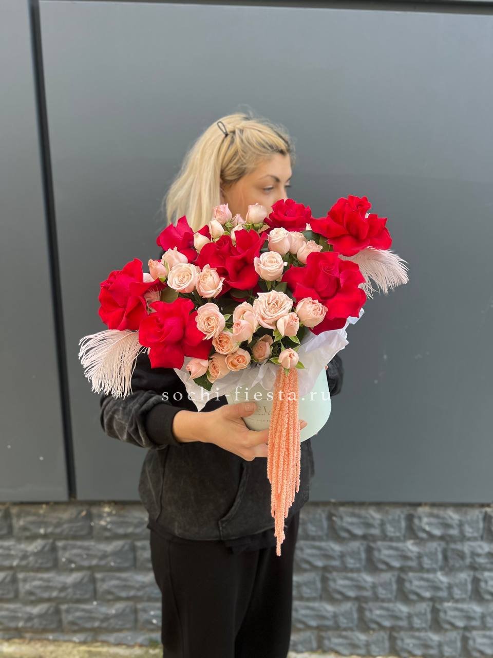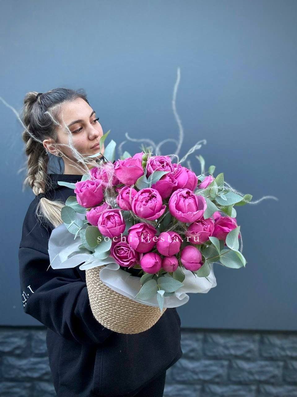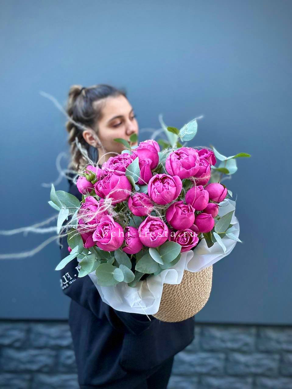 Сто один бутон кенийского пионовидного сорта собраны в масштабную композицию. Белая окантовка лепестков переходит в розовый центр. Впечатляющее присутствие в любом пространстве.