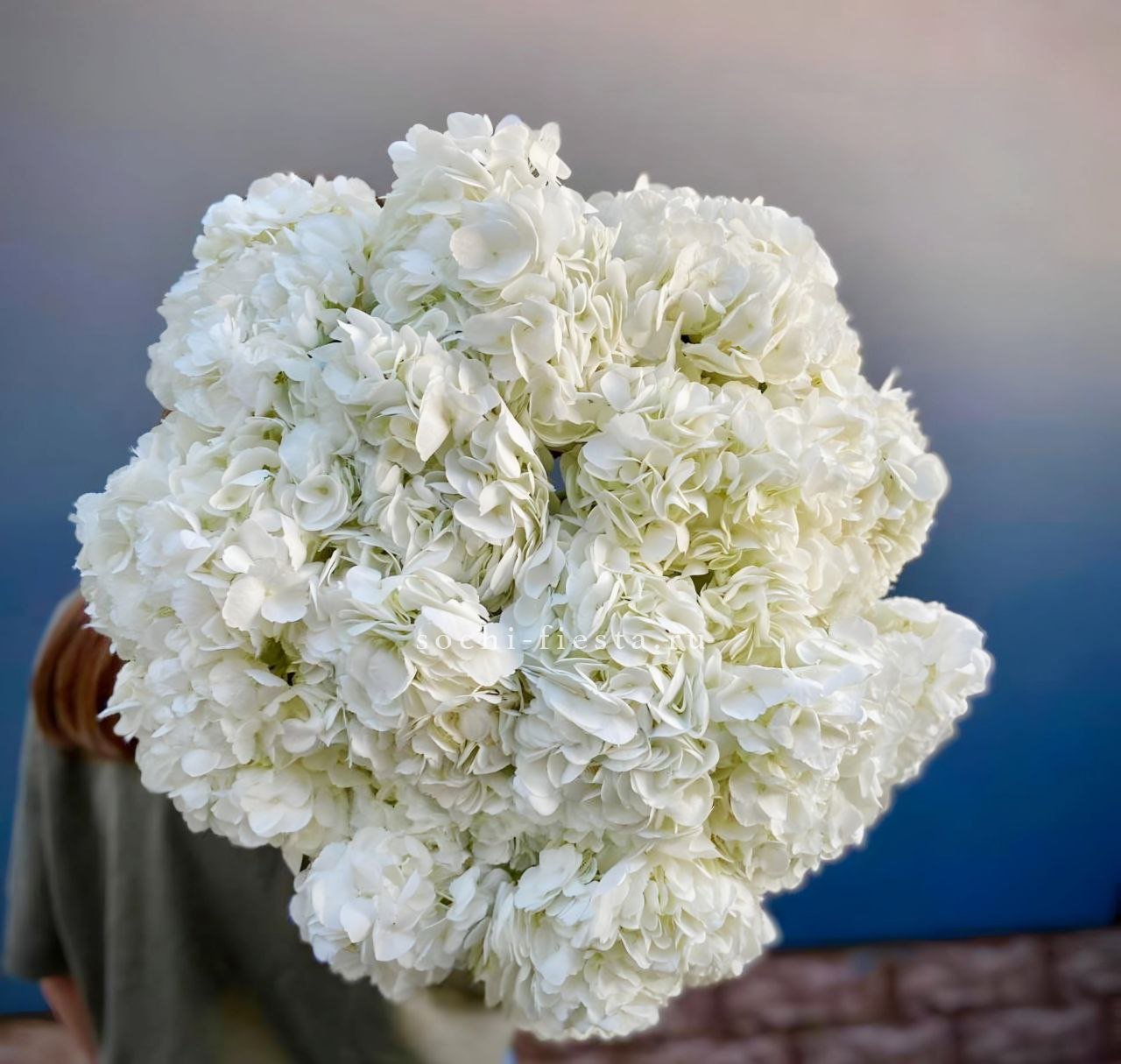 Воздушная палитра белого с голубыми переливами дарит ощущение прохлады и свежести. Пять соцветий гортензии образуют мягкую композицию, где каждый оттенок перетекает в другой, создавая глубину.