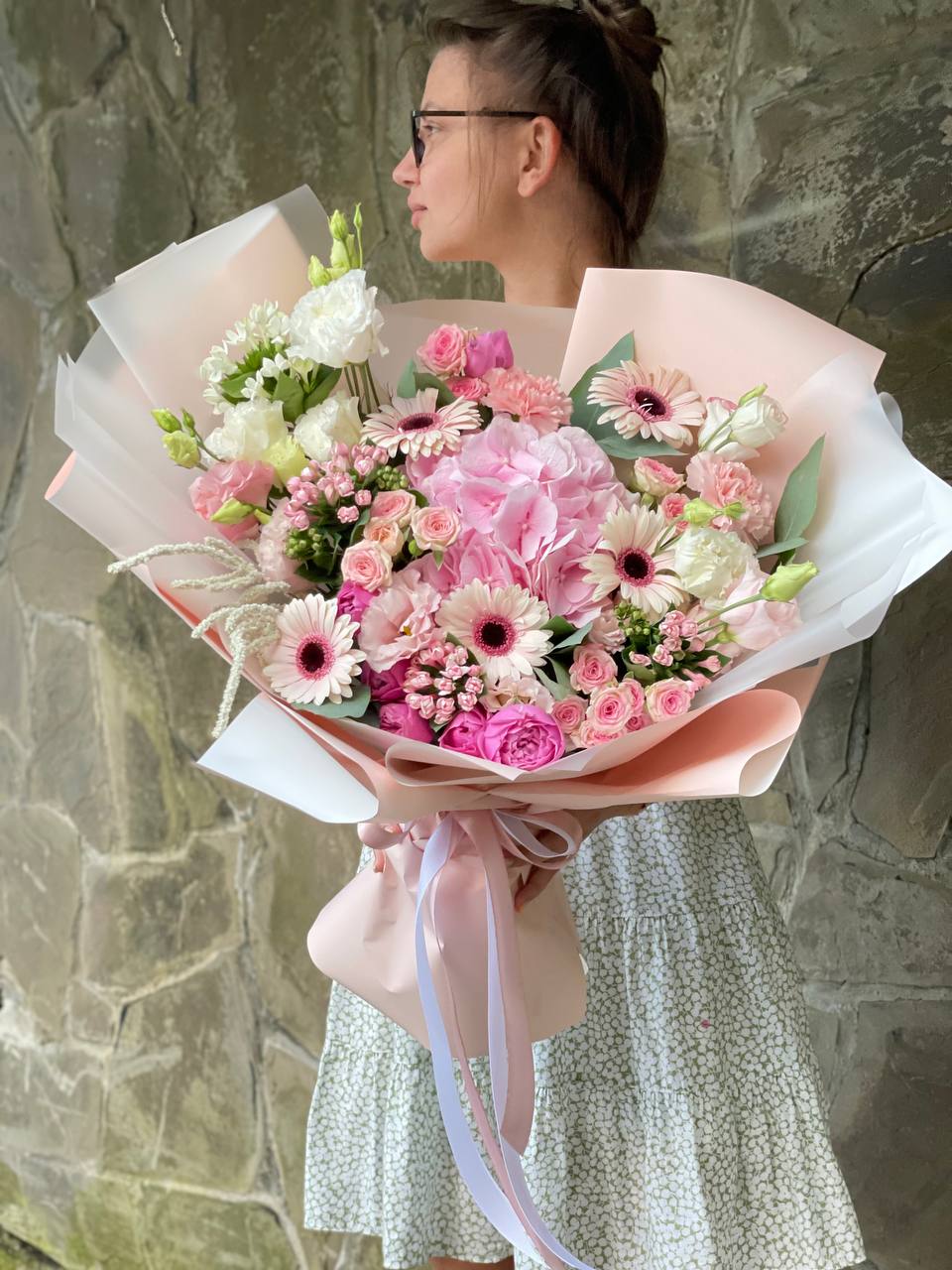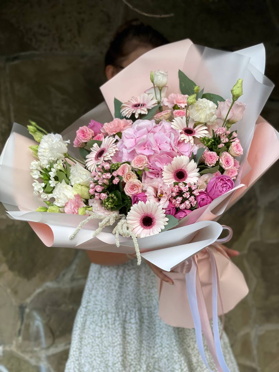 Пятьдесят один бутон в мягкой бело-розовой гамме создает объемную форму с живым ритмом. Микс оттенков добавляет воздушности и естественной динамики композиции.