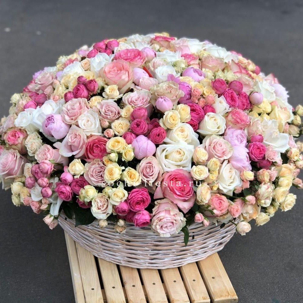 Пышная композиция с насыщенным цветением и многослойной глубиной. Пионовидные формы переплетаются с воздушной эустомой, создавая объём и плавный переход от центра к краям. Каждый бутон раскрыт по-своему.