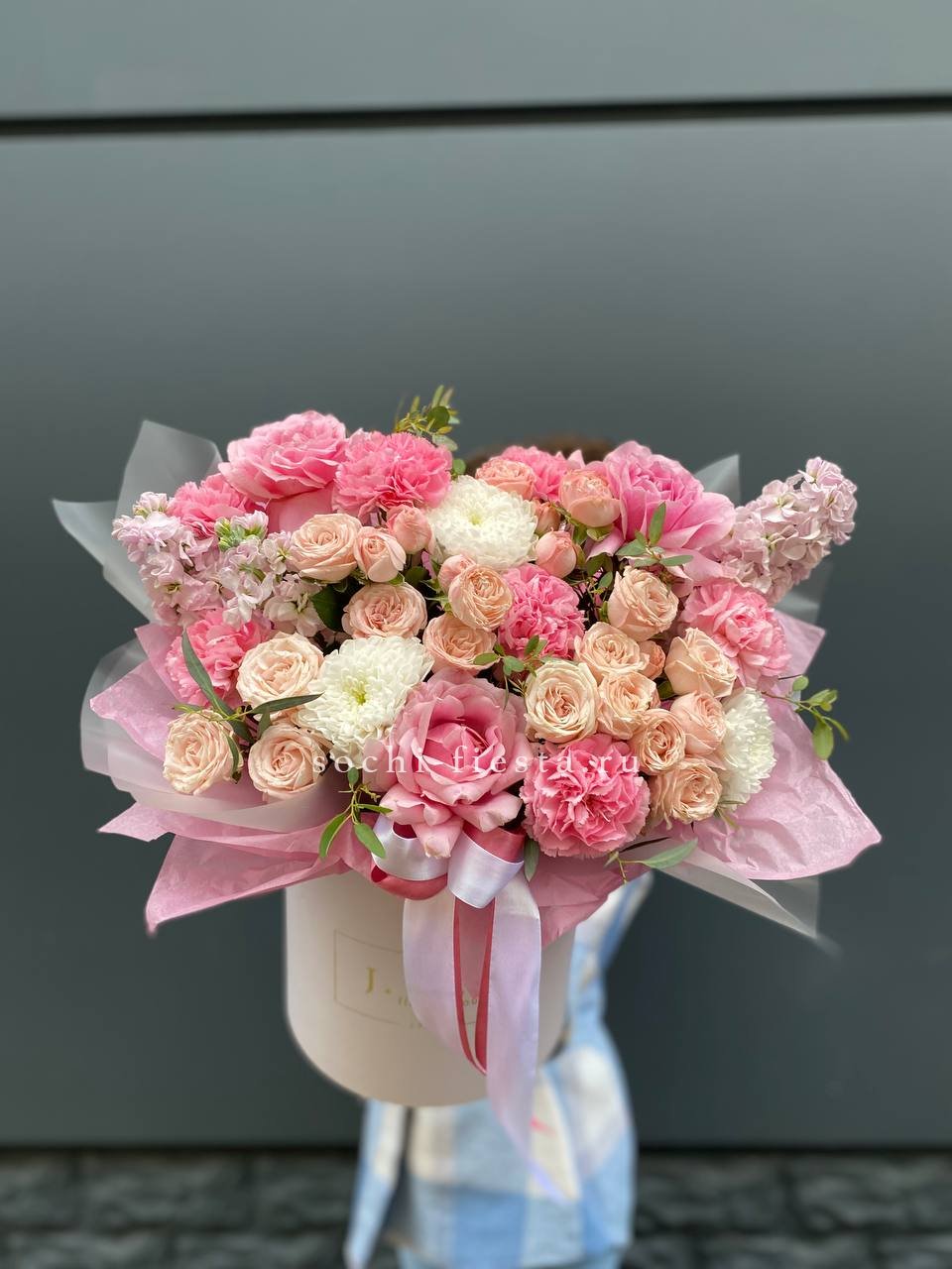 Настоящий цветочный фейерверк в стильной коробке! Эта пышная и многосоставная композиция притягивает взгляды богатством форм и оттенков — от кремового и персикового до насыщенного розового и белого. Это не просто цветы, а целая история о радости, празднике и восхищении. Подарок, который гарантированно произведет яркое впечатление и останется в памяти надолго.