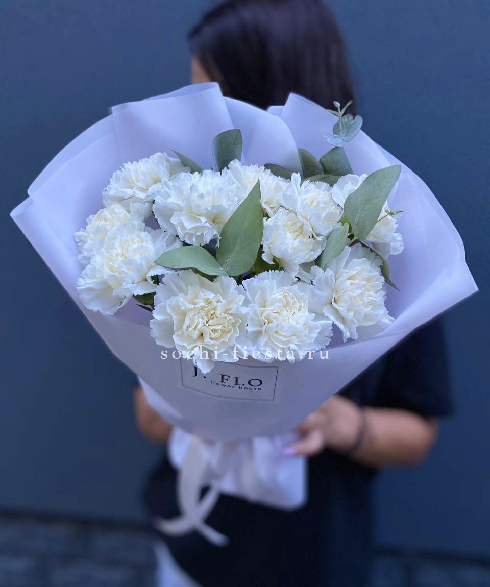 Белоснежные диантусы с пышными лепестками держат форму и долго сохраняют свежесть. Серебристый эвкалипт разбавляет плотность бутонов и добавляет прохладные нотки в композицию.