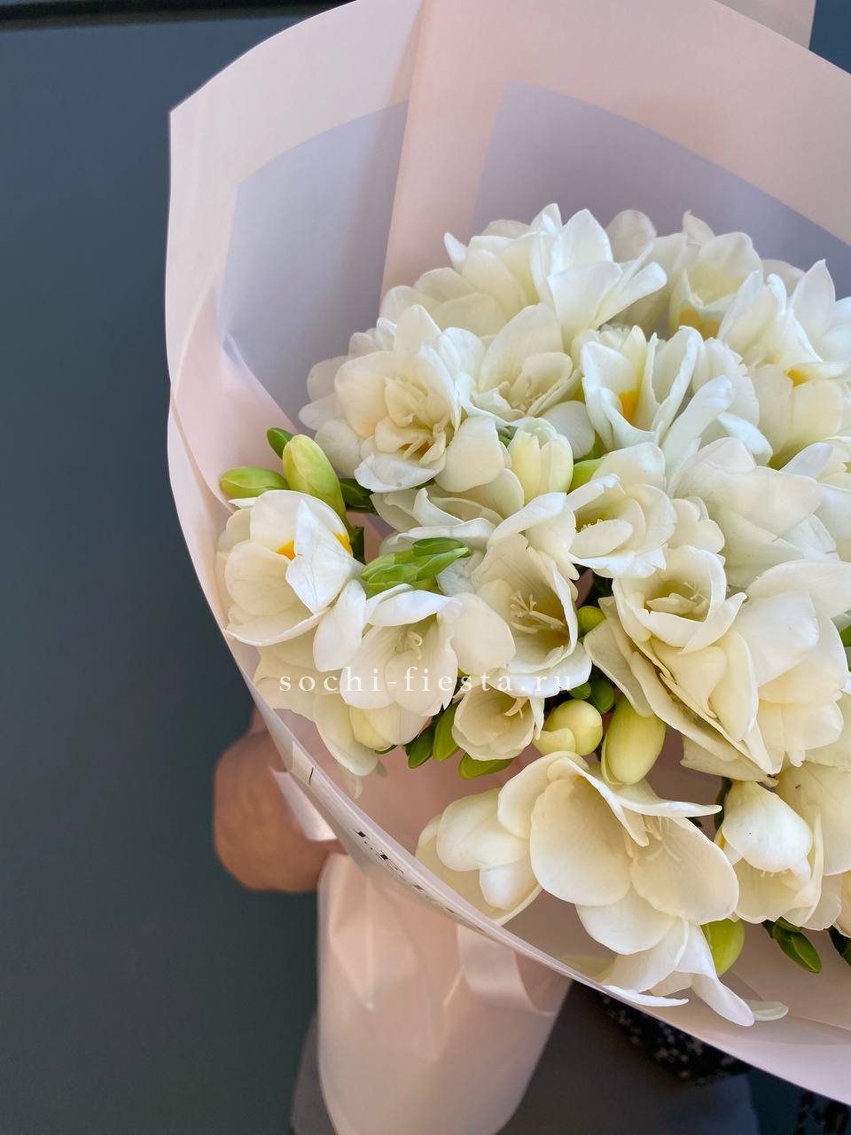 Состав: 25 белых фрезий, оформление, лента