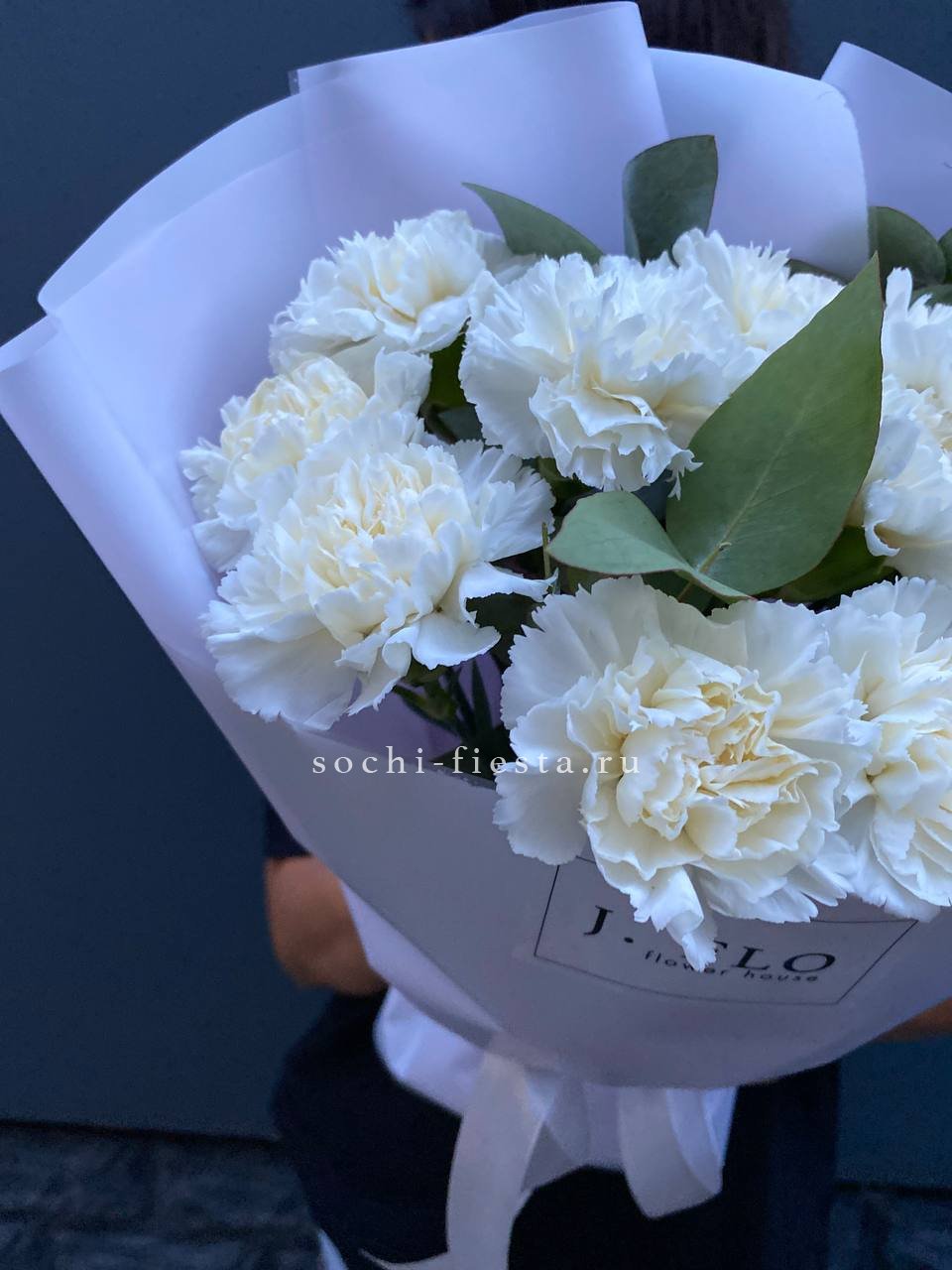 Диантусы с их густыми бутонами и резной формой лепестков выглядят графично и современно. Белый цвет усиливает архитектурность линий и создаёт чёткий визуальный ритм.
