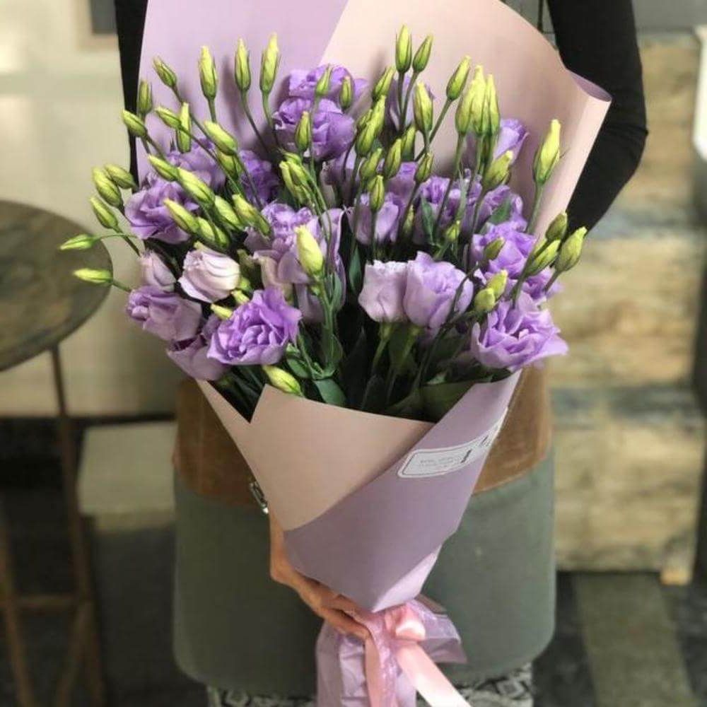 Двадцать пять веточек эустомы собраны в пышный букет и перевязаны лентой. Многослойные бутоны создают воздушный объём и мягкую игру оттенков. Классическая подача для тех, кто ценит естественную красоту цветка.