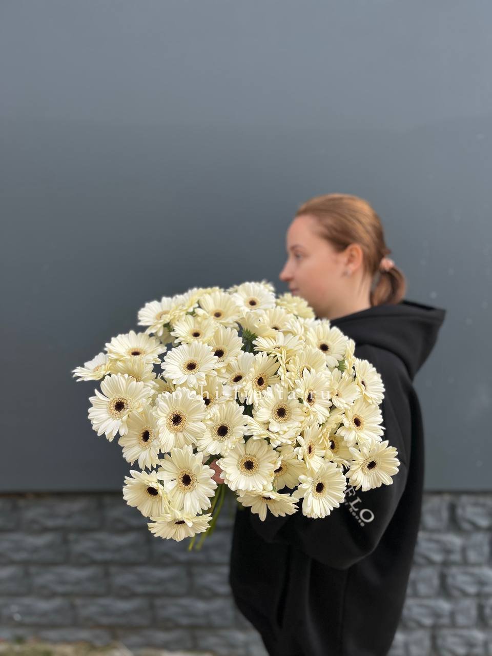 Пятьдесят один бутон под лентой — это объём и яркое присутствие в любом помещении. Герберы выстроены плотно, образуя впечатляющую композицию. Такой букет сложно не заметить.
