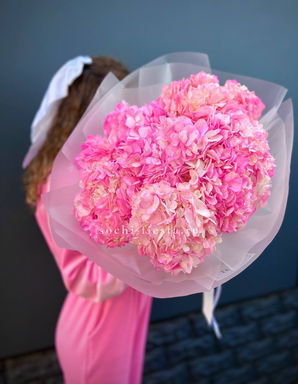 Двадцать одна гортензия разных оттенков собрана в пышную охапку с мягкими переходами цвета. Шаровидные соцветия создают плотную текстуру, а их природная стойкость позволяет наслаждаться букетом долго.