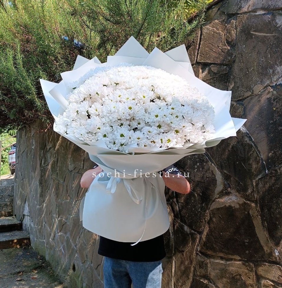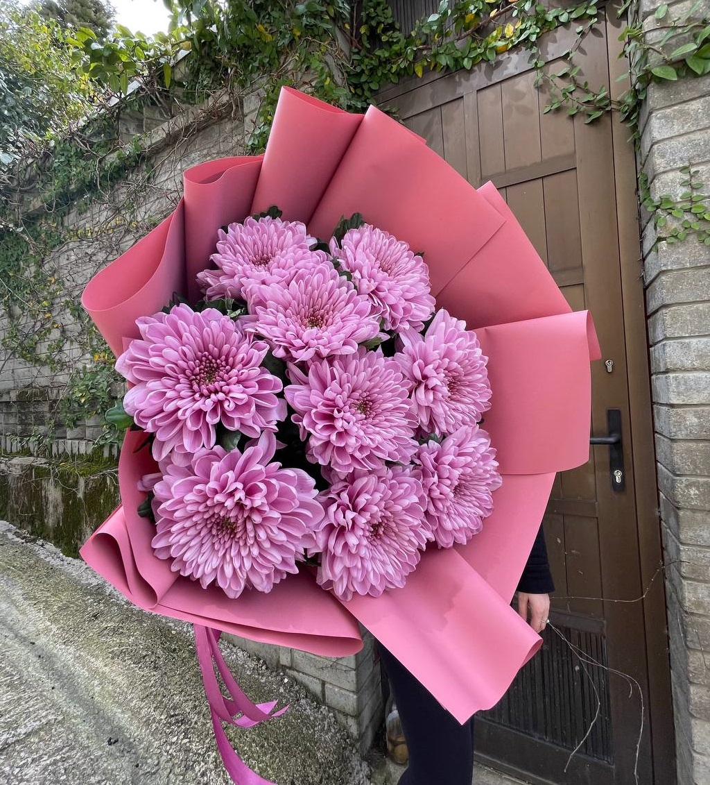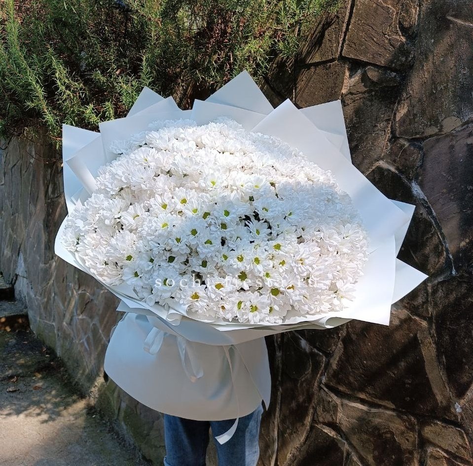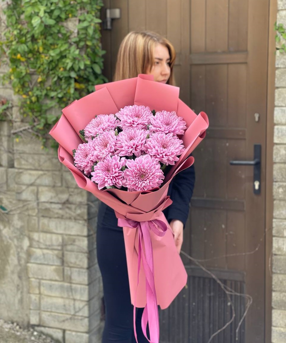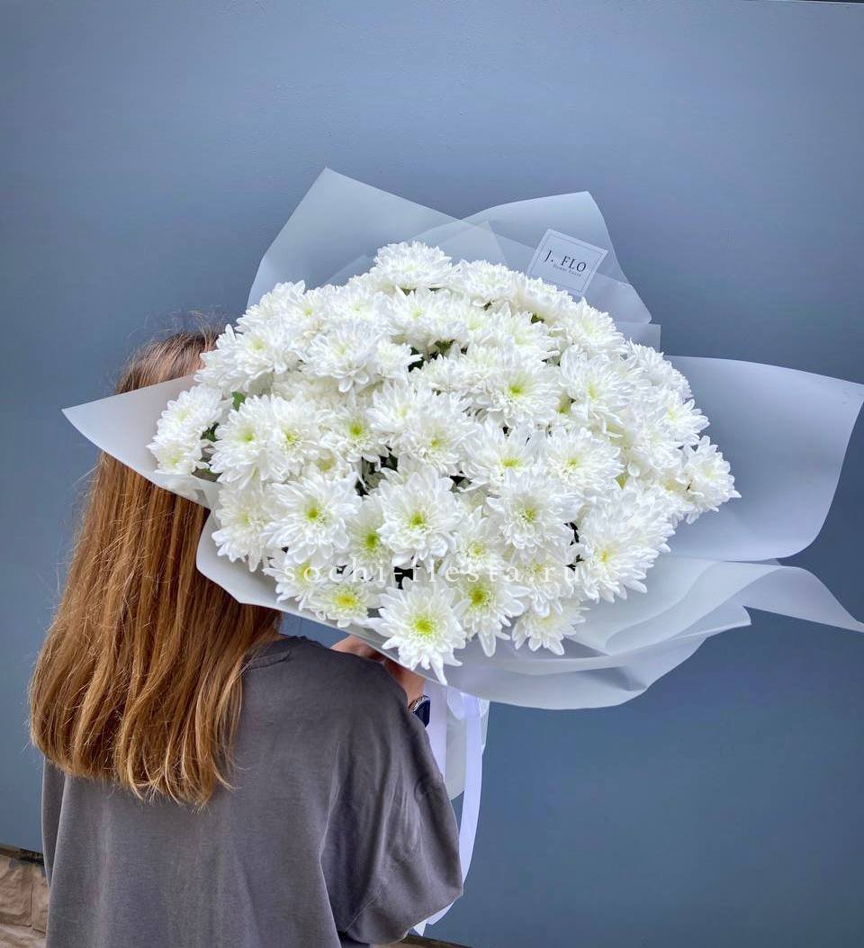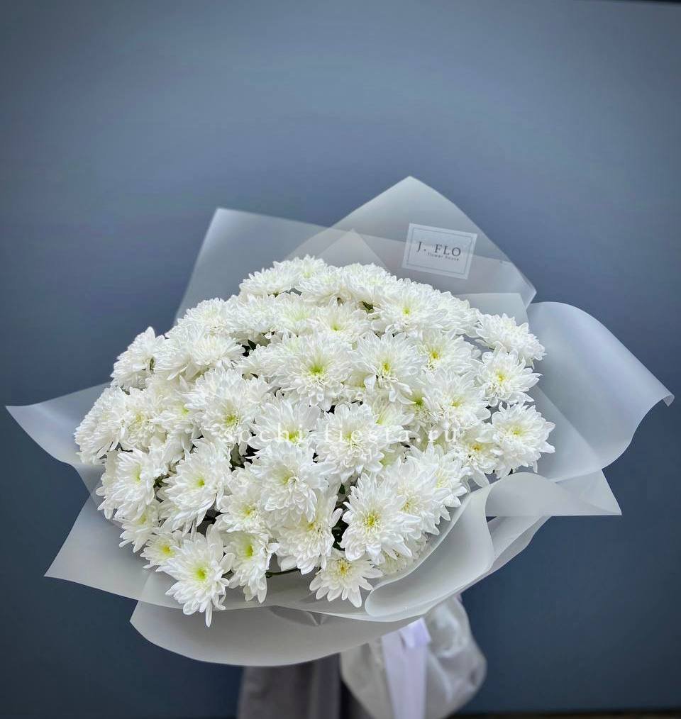 Fifteen веток кустовой хризантемы образуют пышное облако из множества мелких бутонов. Простая упаковка не отвлекает от густоты соцветий и их природной фактуры. Букет долго сохраняет свежесть и объём.