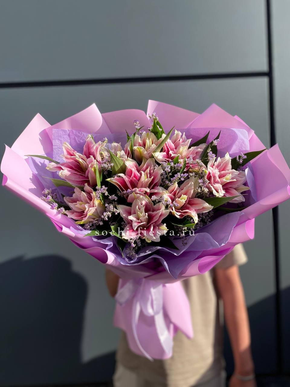 Пионовидные лилии с махровыми бутонами дополнены воздушным лимониумом. Девять стеблов образуют пышную форму, где каждый цветок раскрывается слоями.