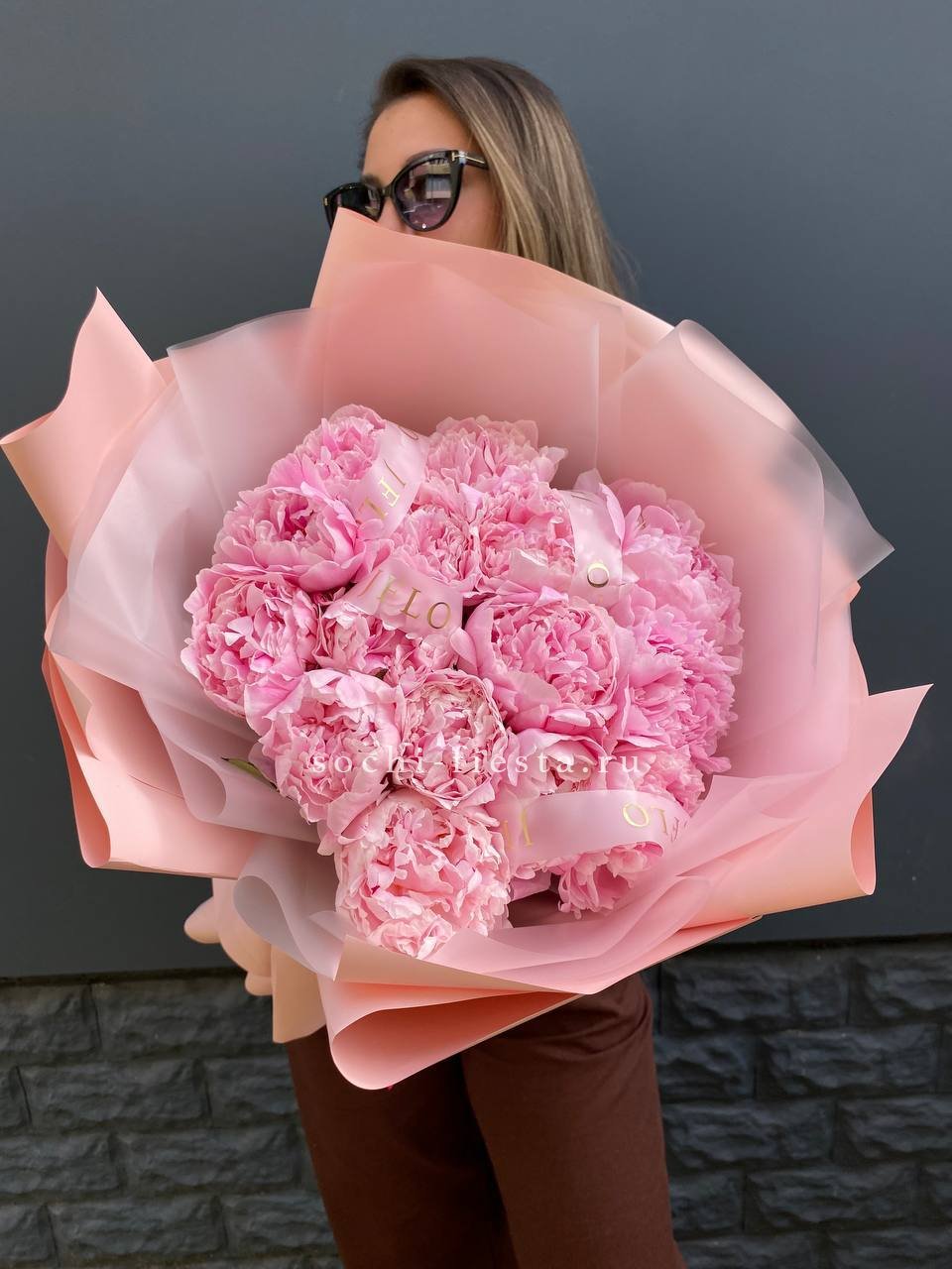 15 розовых местных пионов, лента, комбинированное оформление.