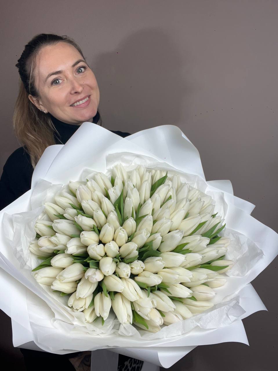 Сто один бутон в бело-розовой гамме выстраивается в объёмную композицию с плотным силуэтом. Каждый тюльпан держит свою линию, создавая ритмичную структуру букета.