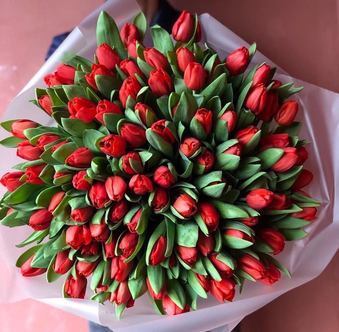тюльпан 61 шт., лента, дизайнерская бумага.