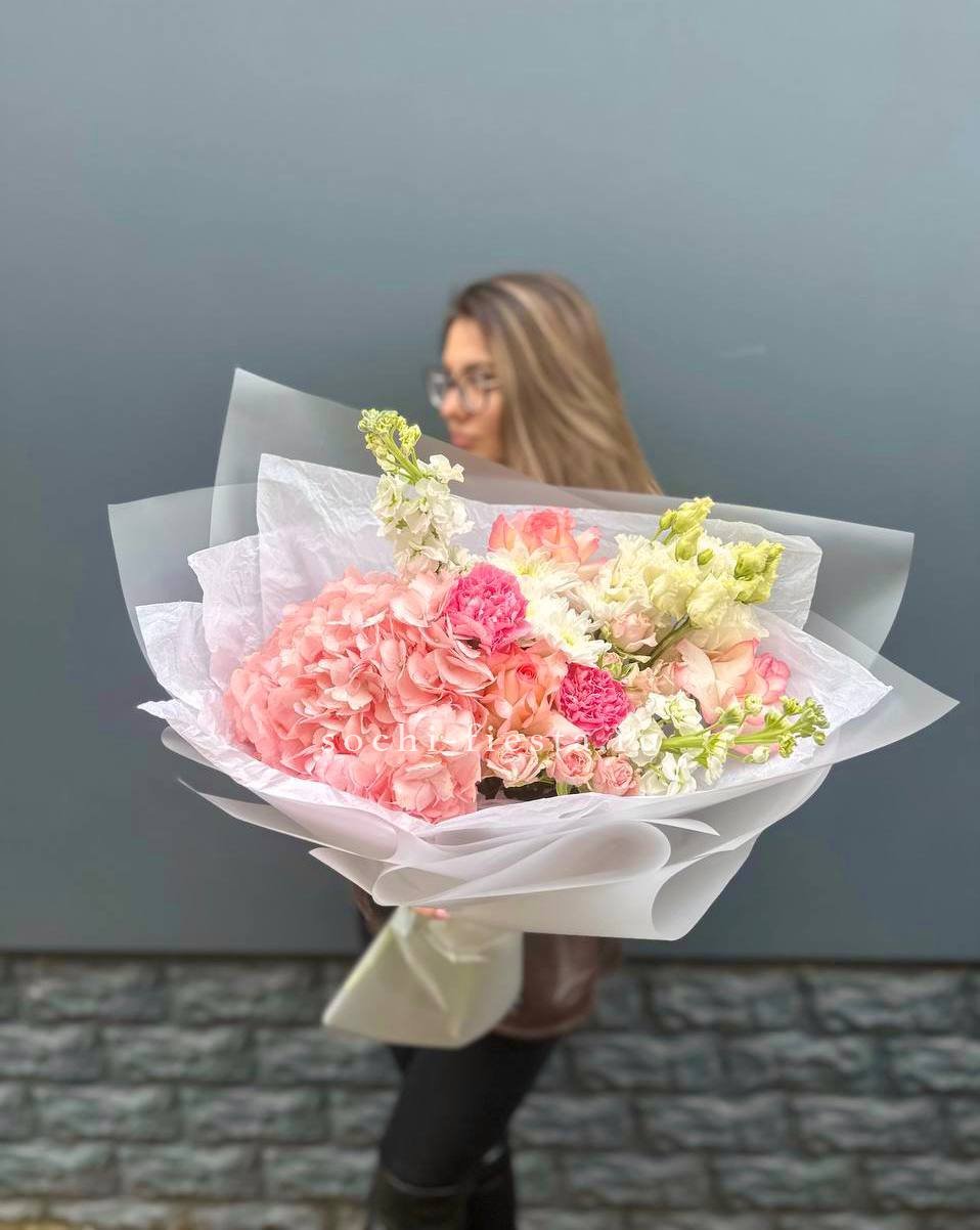 Пышный микс соцветий гортензии, роз и гербер с добавлением перьев и озотамнуса. Авторская композиция объединяет садовую свободу и графичную точность линий.