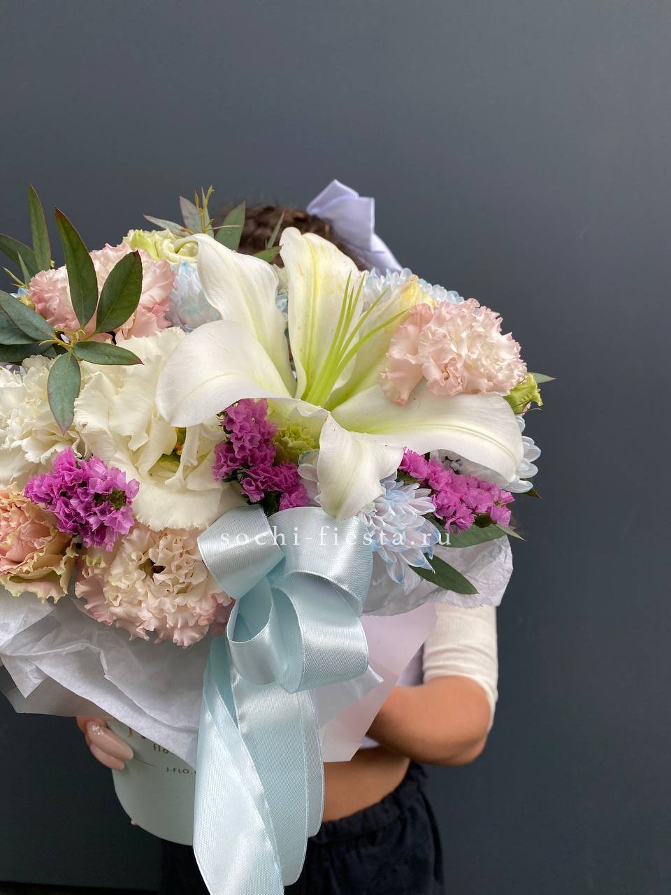Композиция собрана из белых лилий и мелких соцветий в лавандовых и розовых тонах. Цилиндр объединяет цветы разной высоты и создает впечатление летнего букета в компактной форме.