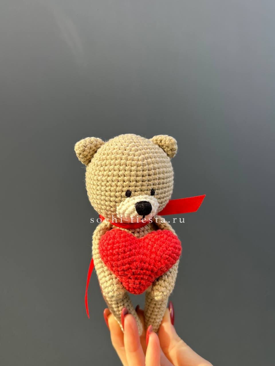 Плетёная фигурка с объёмным красным сердцем в лапах создаёт тёплое впечатление. Ручная работа заметна в каждой детали. Дополнит любой подарок душевной интонацией.