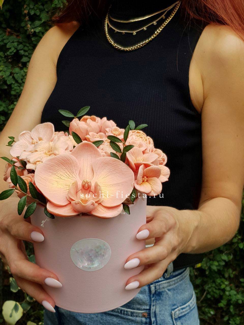 Орхидеи из бельгийского шоколада собраны в компактную композицию с выразительной формой лепестков. Каждый бутон воссоздает природную фактуру и объем. Необычное решение для тех, кто ищет альтернативу живым цветам.