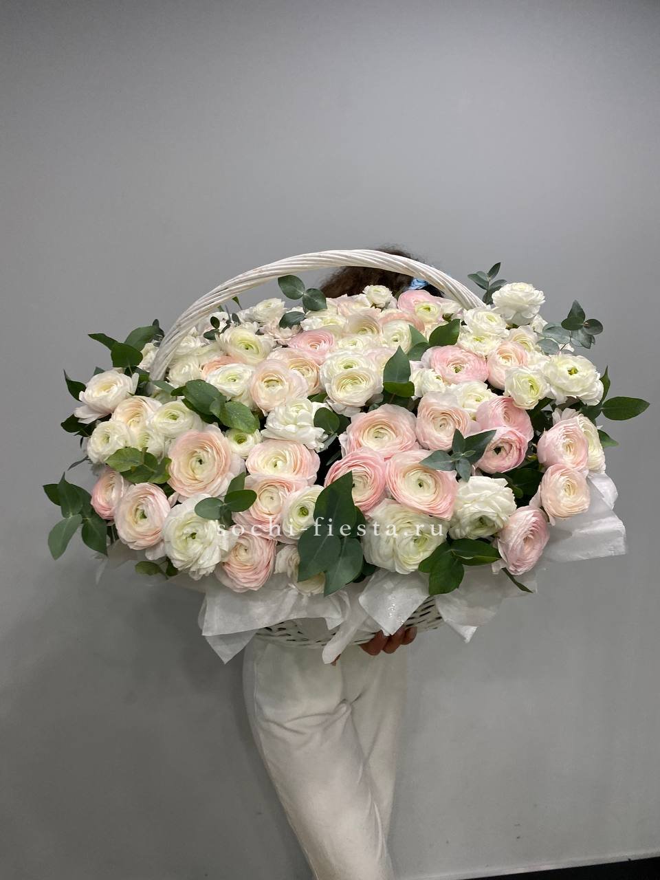 розовая роза, пионовидная роза, диантус, эвкалипт, лента, сумка-кашпо.