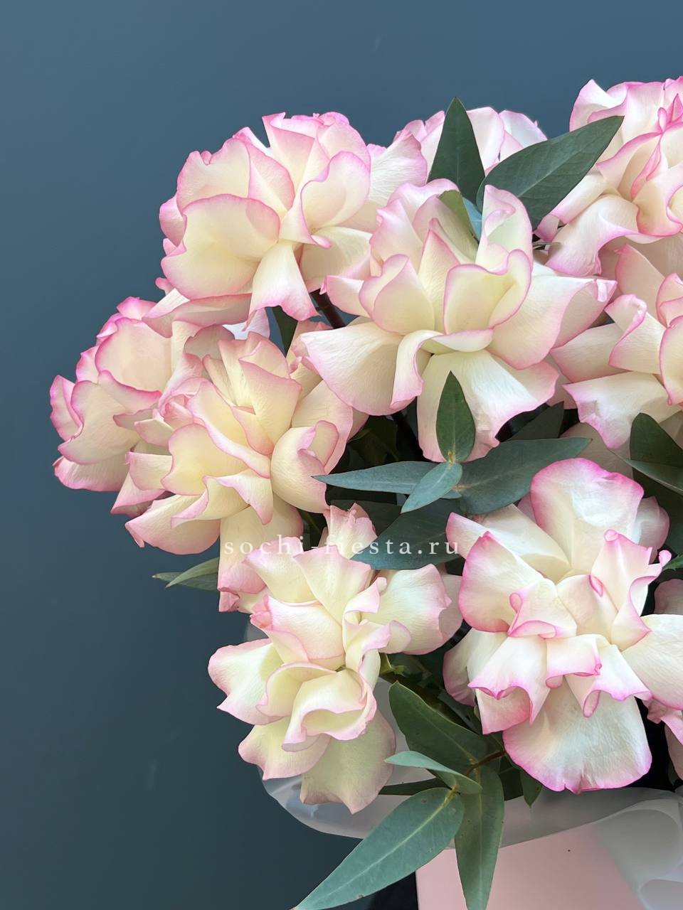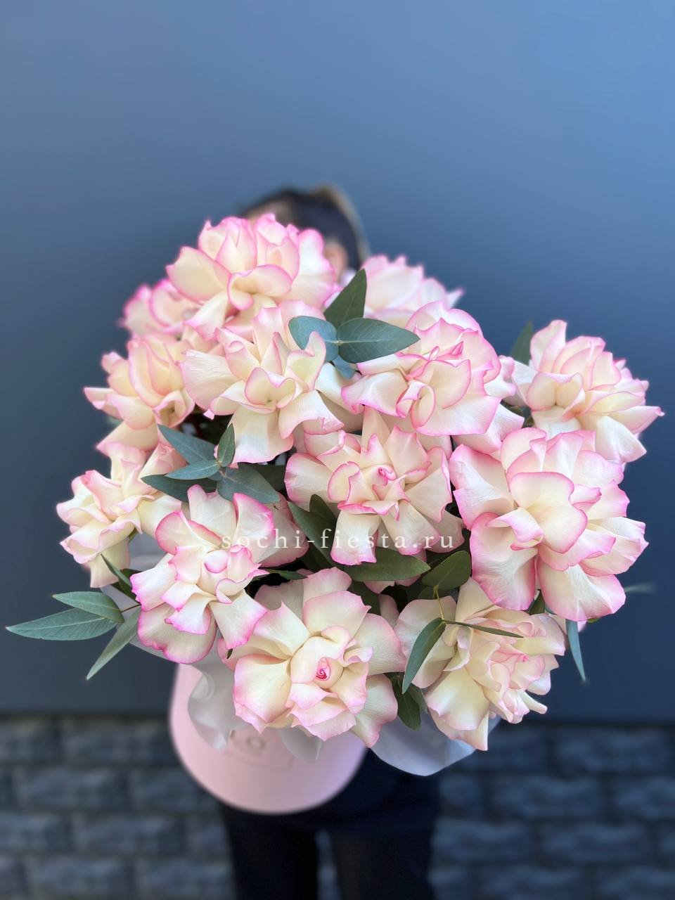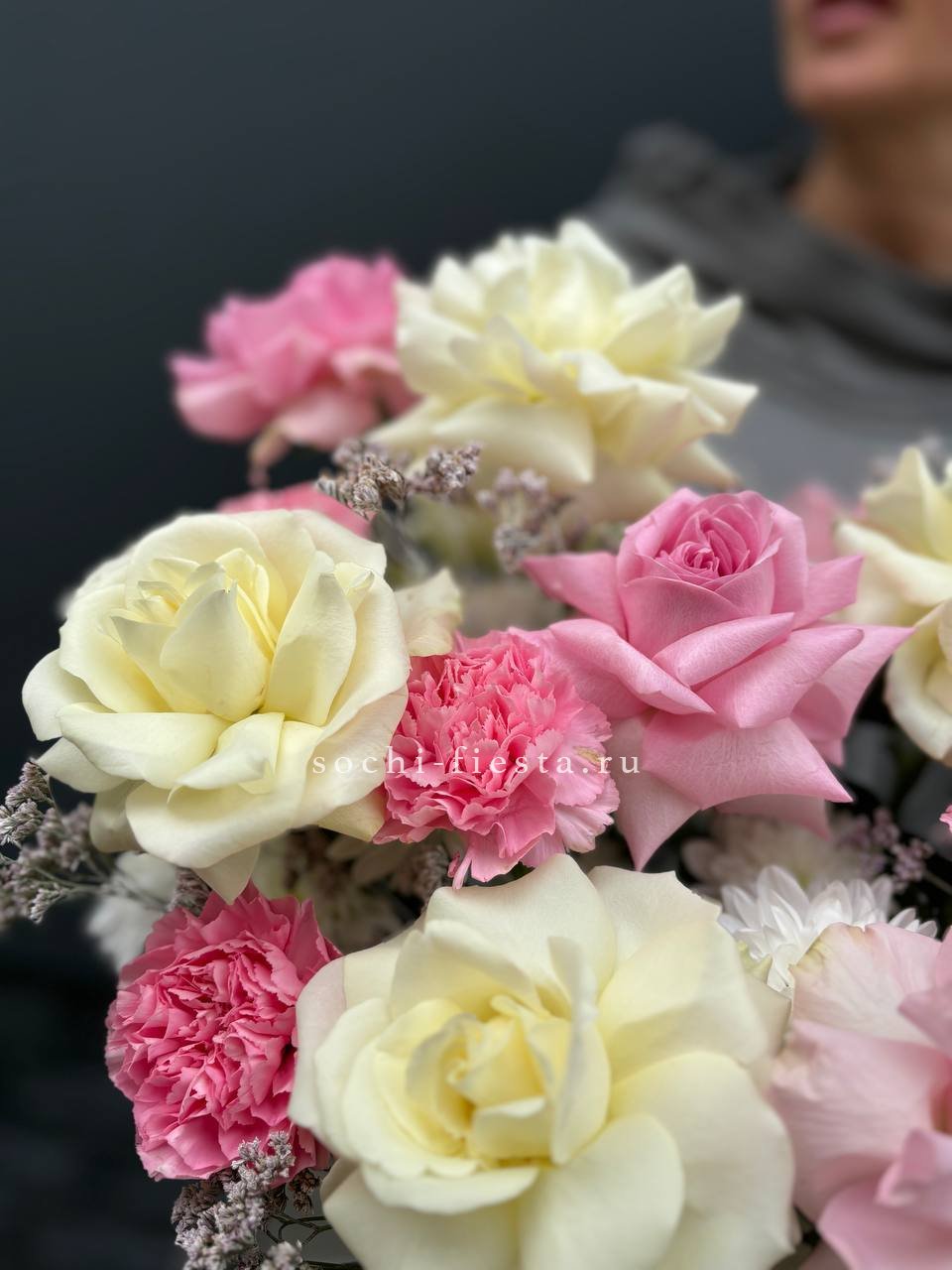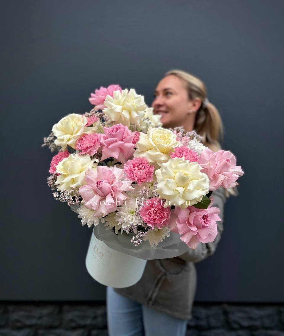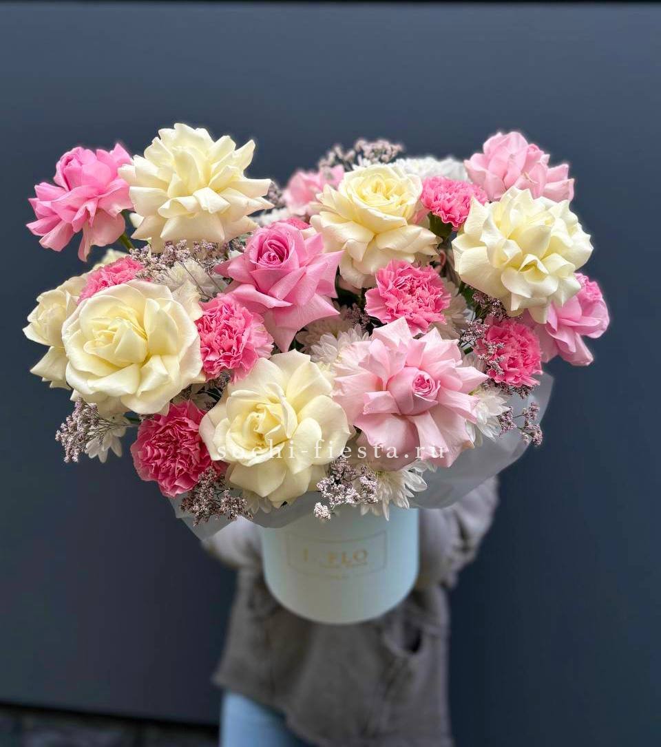 Для заказа товара "Коробка французских роз и диантусов "Бони"" с доставкой в Владимире нажмите в корзину