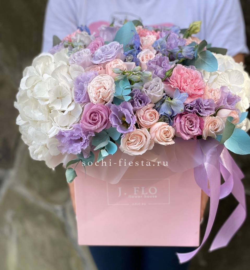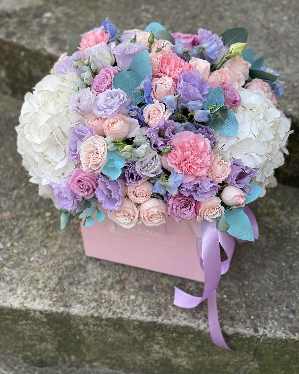 гортензия, эустома, диантусы, розы, эвкалипт и прочие цветы, гармонирующие по фактуре. Цветочная композиция в белых, нежно-сиреневых, розовых тонах в квадратном боксе D25.