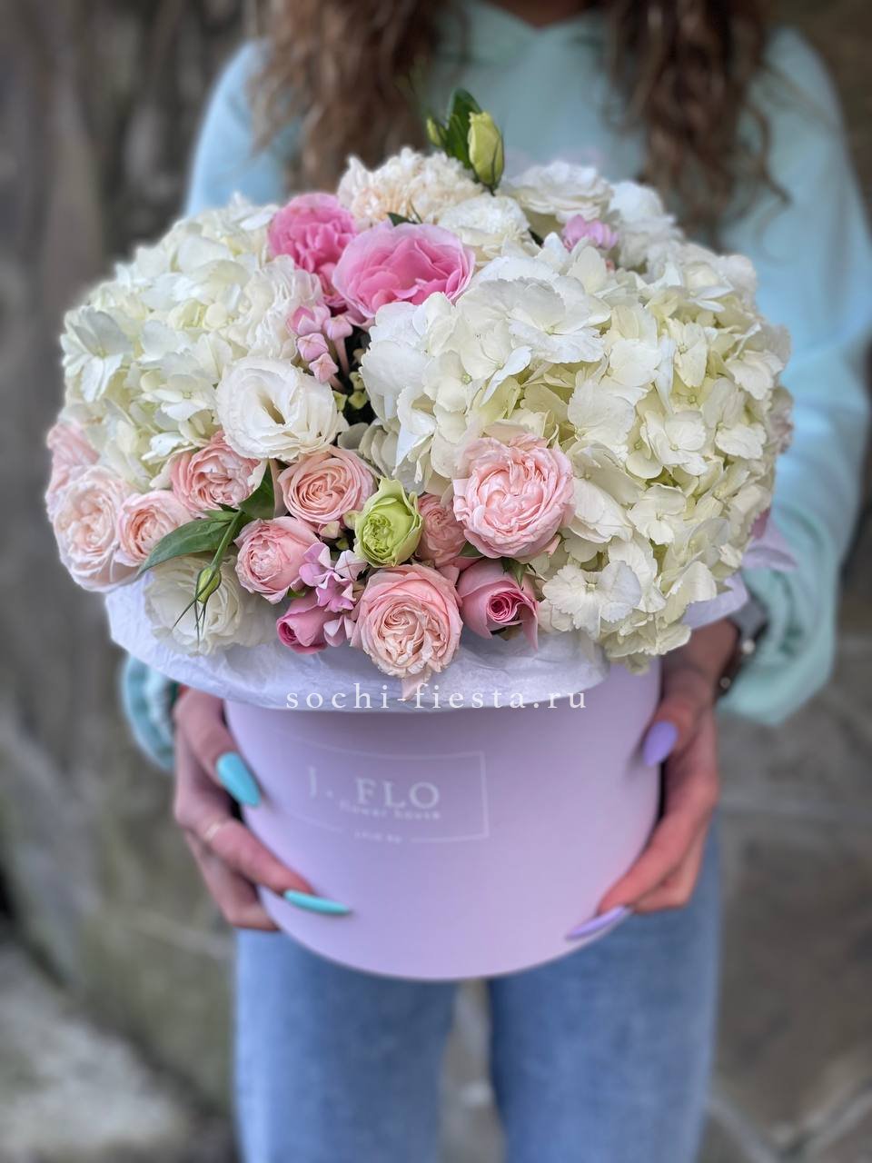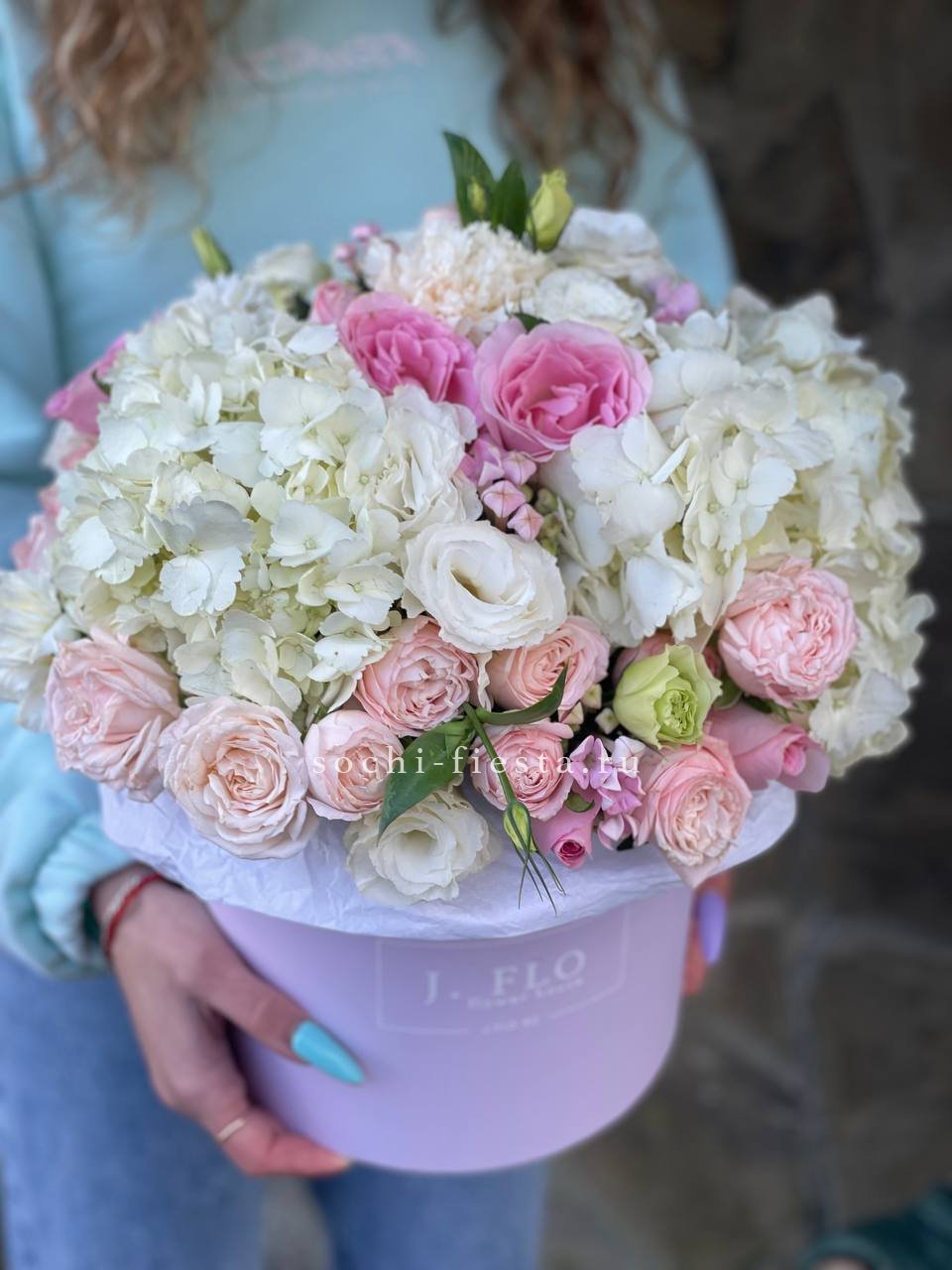 Пышная композиция с раскрытыми шапками гортензий и многослойными бутонами роз заполняет квадратный бокс. Белые и сиреневые переходы создают мягкую глубину, а эвкалипт освежает общую картину.