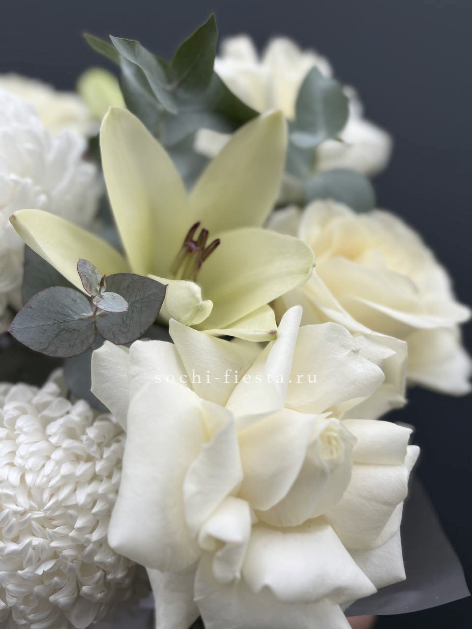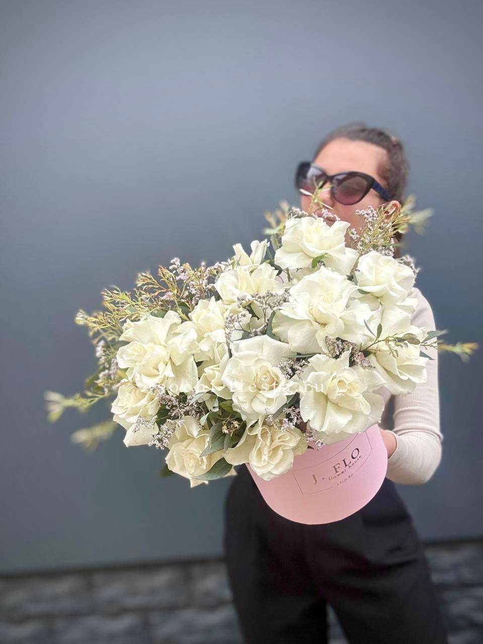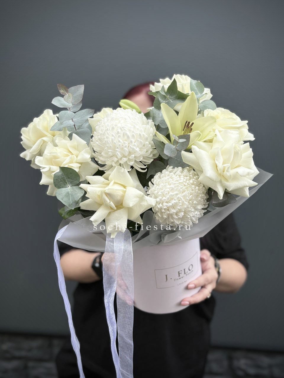 Семнадцать белых роз с раскрытыми лепестками образуют плотную округлую форму в цилиндре. Эвкалипт и лимониум добавляют фактурные переходы между бутонами.