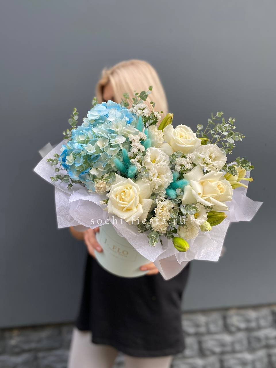 вывернутые белые розы , цилиндр D20, эвкалипт, лента, упаковка.