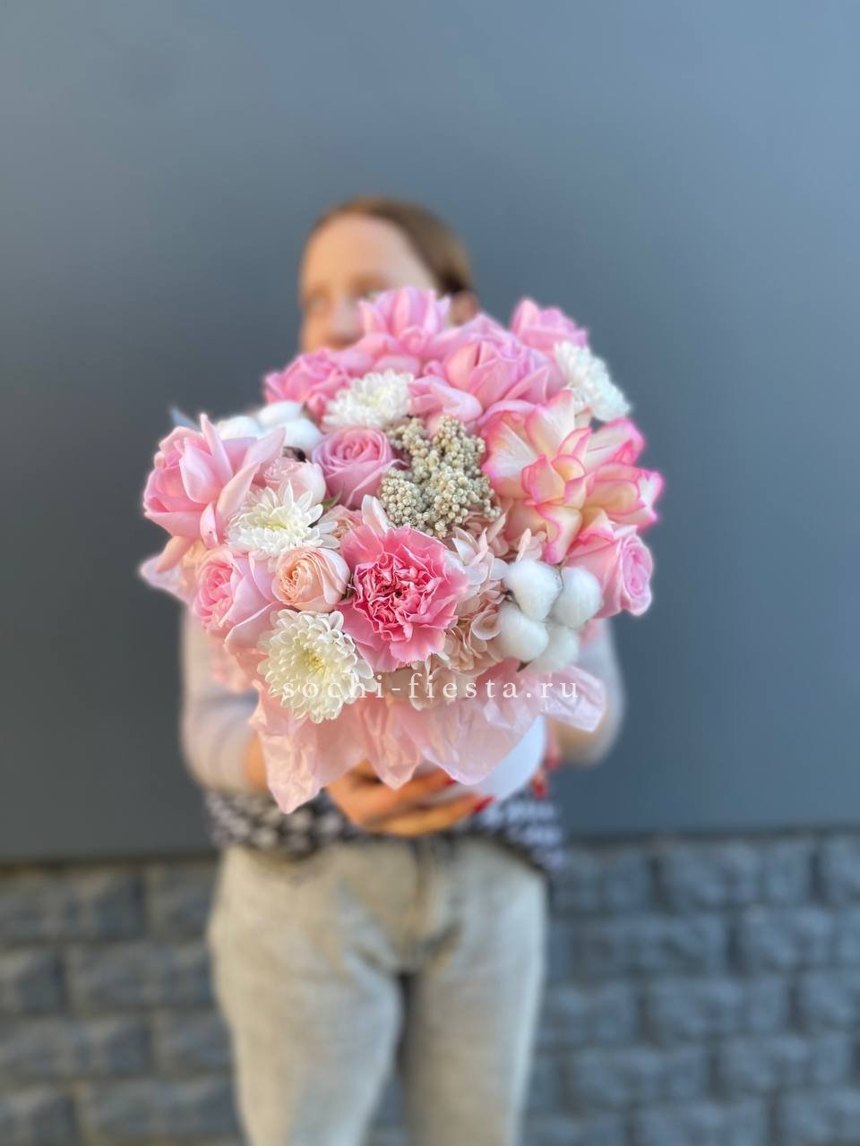 гортензия, розы, озотамус, диантус, бомбастик, хлопок, хризантема бокс 16.