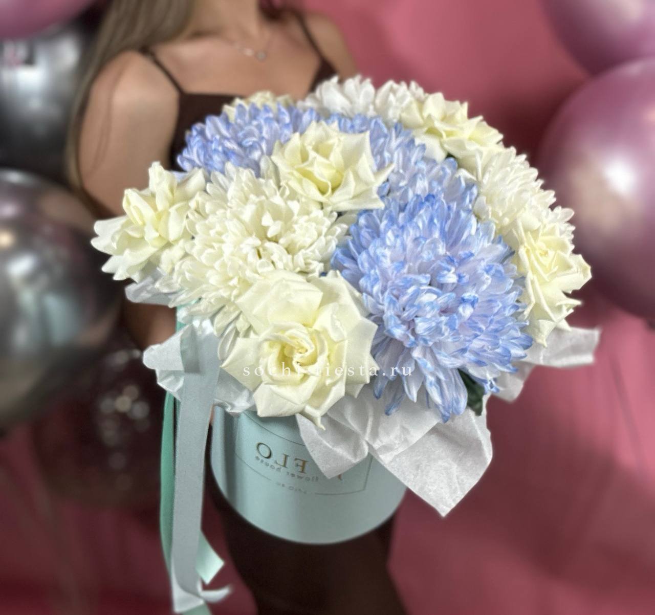 Белые розы с вывернутыми лепестками создают воздушную текстуру в сочетании с хризантемами. Композиция собрана в цилиндре и перевязана лентой. Свежее решение для светлого интерьера.