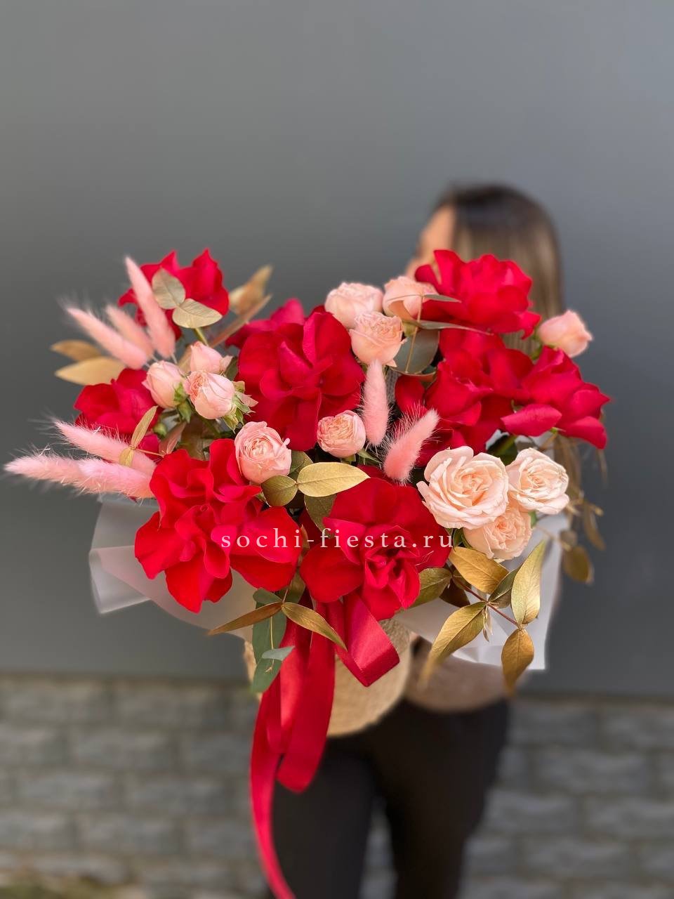 белые розы, красные розы, джумилия, цилиндр D20,  лента.