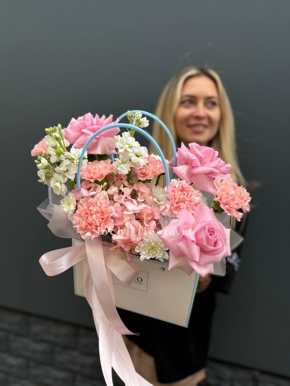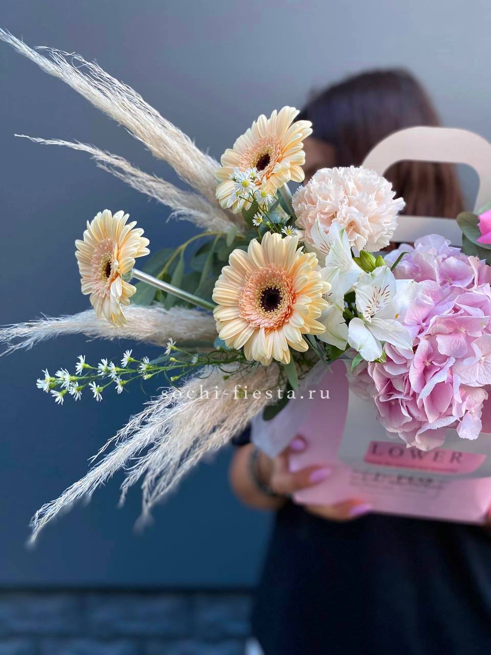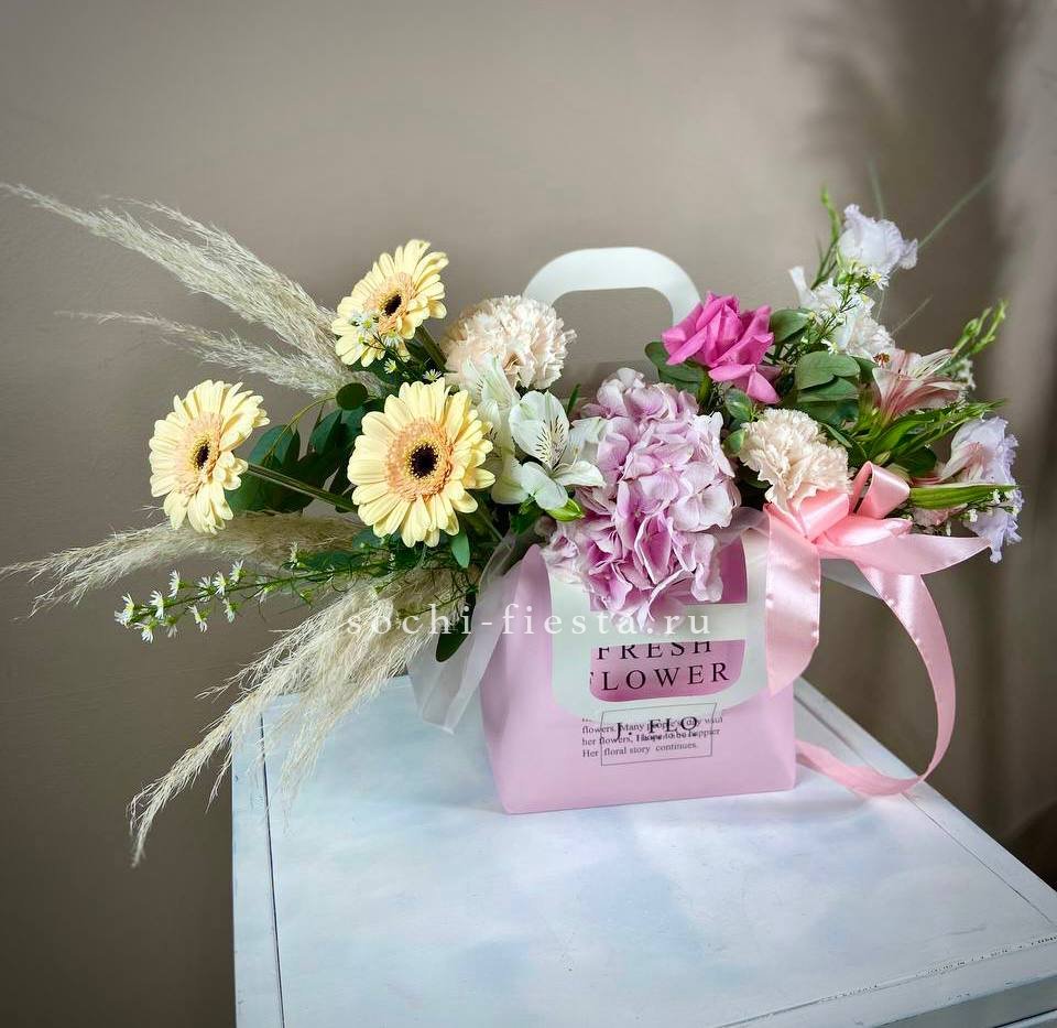 Гортензии задают плотную основу, герберы и диантусы вносят ритм, а альстромерии с эустомой создают движение вверх. Разнообразие форм и оттенков выстраивает многослойную картину в одной сумке.