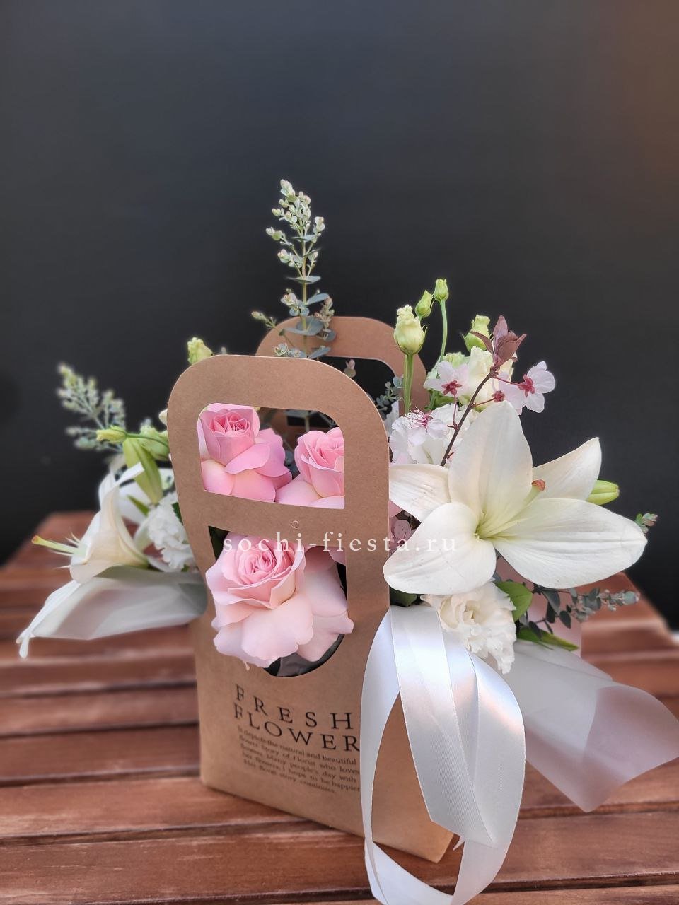 Белоснежные розы переплетаются с воздушной эустомой и раскрытыми лилиями в аккуратной цветочной сумке. Эвкалипт создаёт прохладный фон для светлых бутонов. Композиция на оазисе сохраняет свежесть и форму долгое время.
