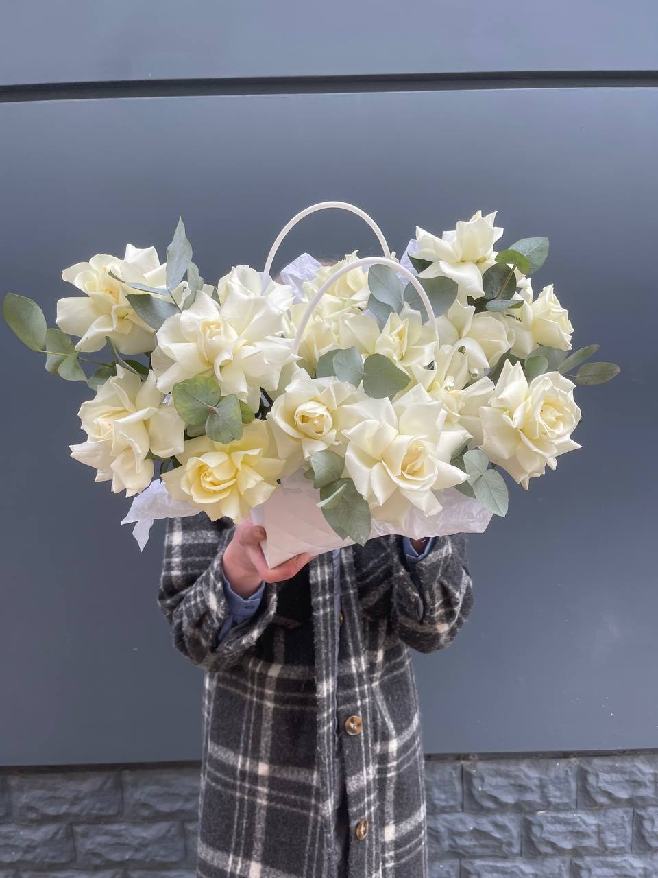 нежная композиция на базе оазиса с применением одноголовых роз, эустомы, гортензии, диантусов, эвкалипта, упаковки.