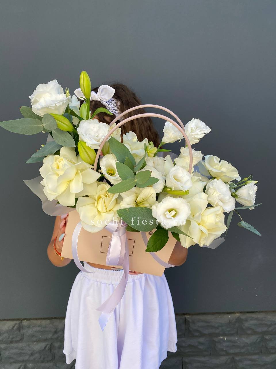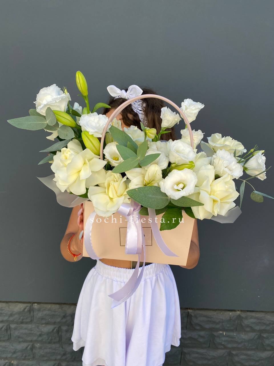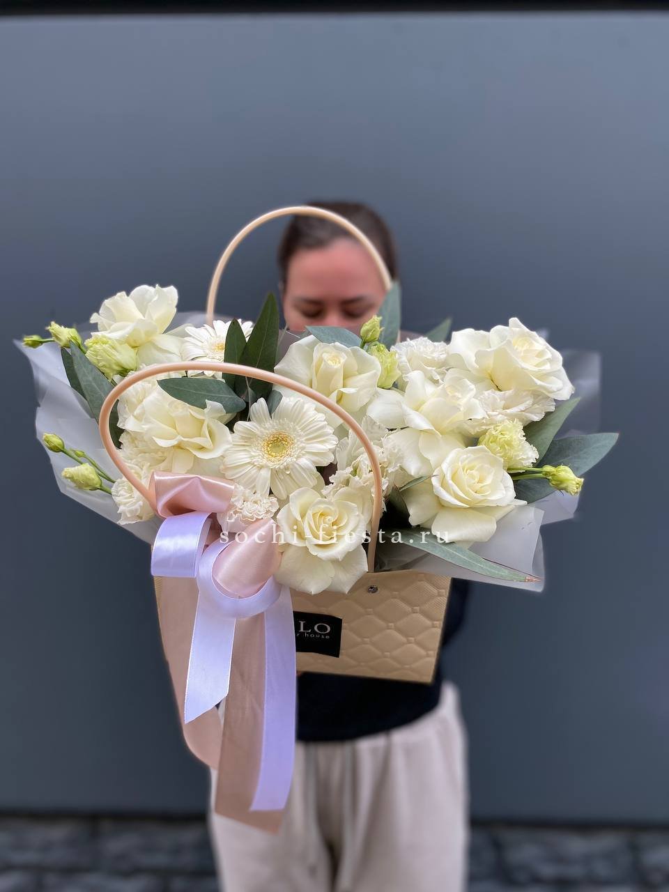 Весенняя композиция в миниатюрной сумочке собрана из хризантем, роз и пушистых веток вербы. Хлопок добавляет мягкости, а эвкалипт освежает общую картину. Компактная форма позволяет разместить её на столе или комоде.