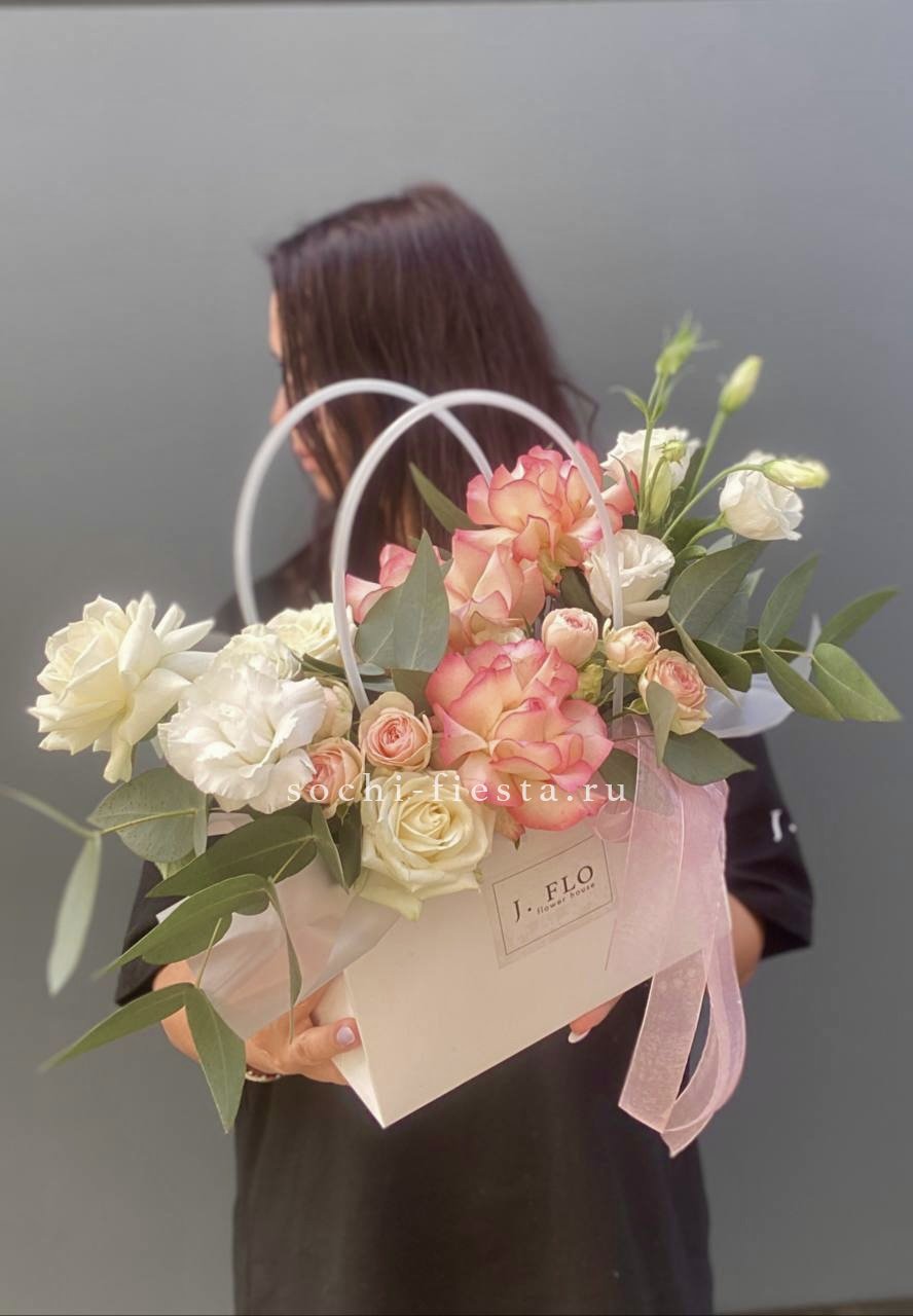 Пионовидные розы раскрываются пышными шапками рядом с воздушными соцветиями эустомы. Компактная форма сумочки удобна для вручения и не требует поиска вазы.