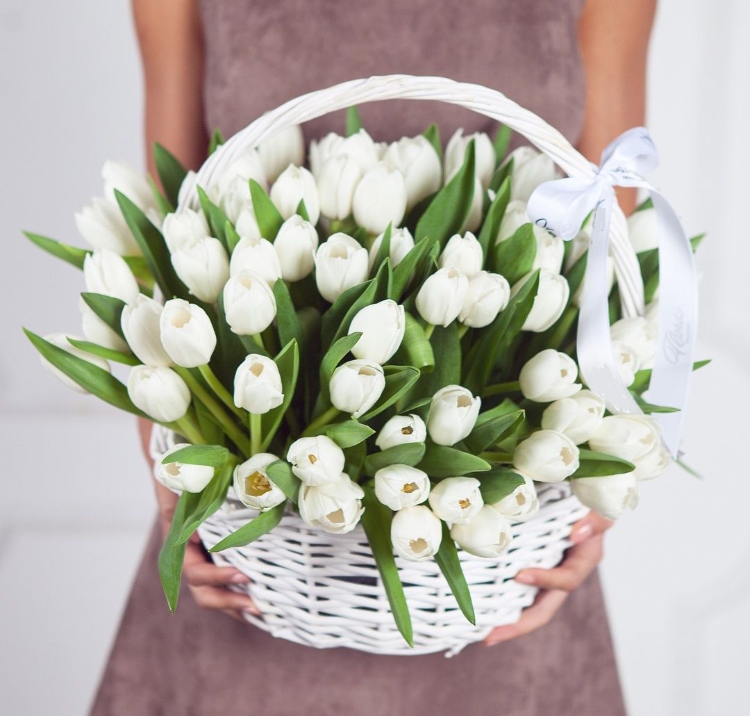 Пятьдесят один белый тюльпан выстроен плотными рядами в белой корзине. Чистая монохромная композиция держит вертикальную форму и выглядит графично в любом интерьере.