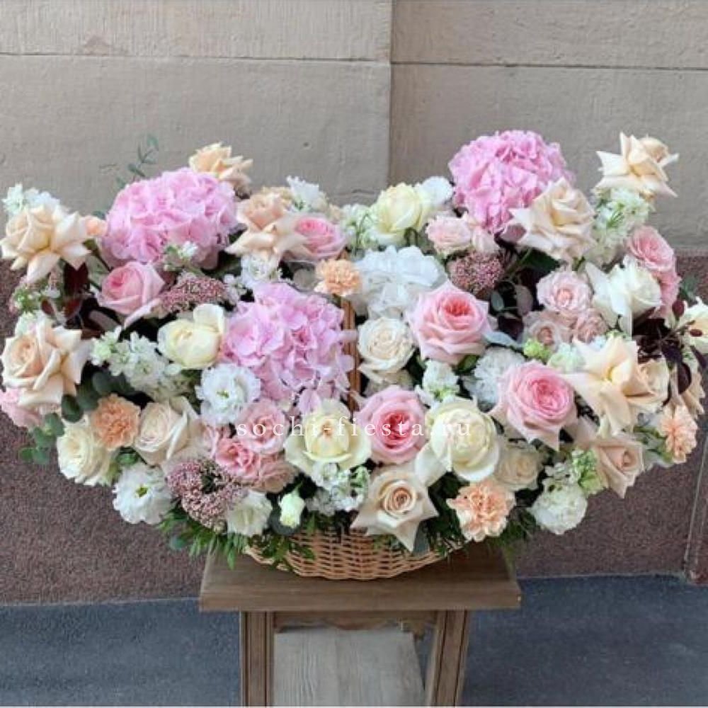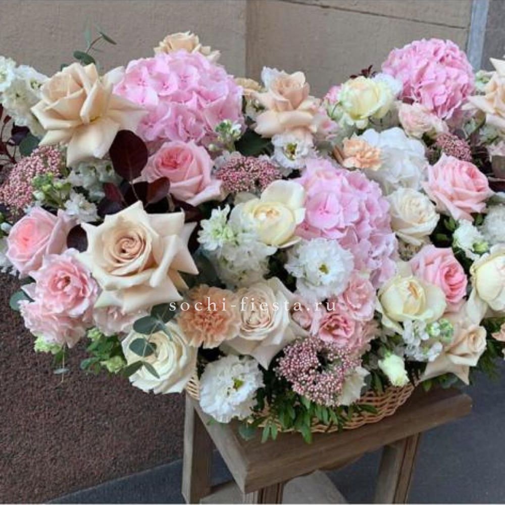 Восемь видов цветов складываются в harmonичную композицию со светлой корзиной в основе. Диантусы и эустома перекликаются с розами, а гортензия задает мягкий объем всей структуре.