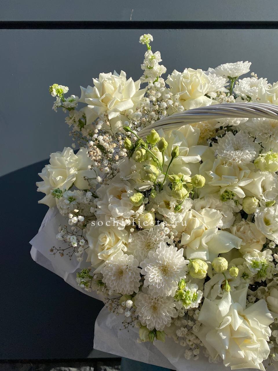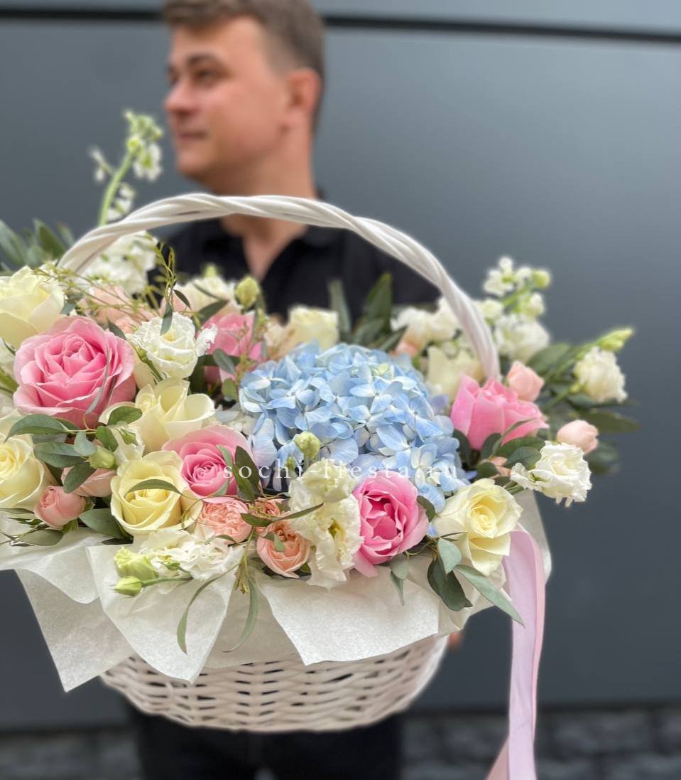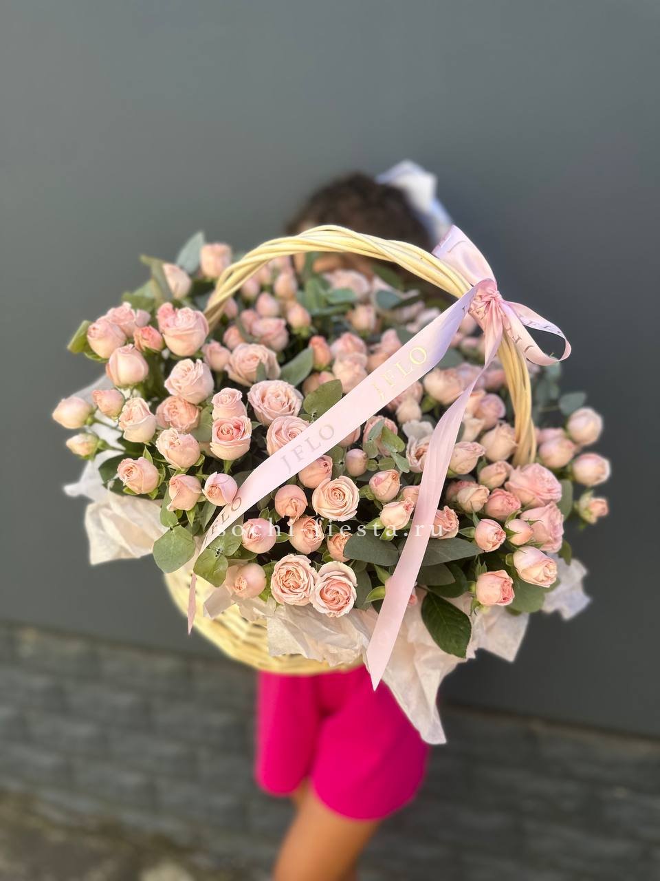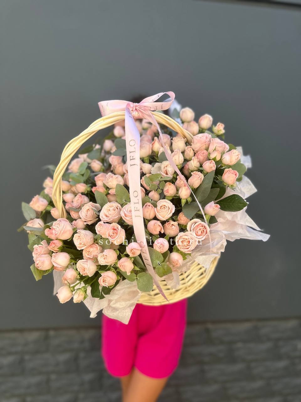 Плотная сферическая форма из пышных бутонов создаёт объёмную композицию в плетёной корзине. Ветки эвкалипта добавляют воздушности между головками цветов. Классическое решение для яркого события или знакового дня в жизни близкого человека.