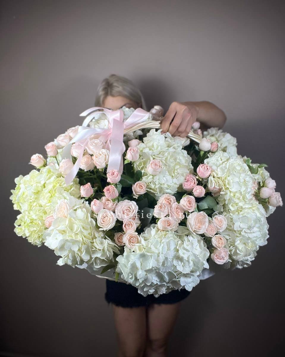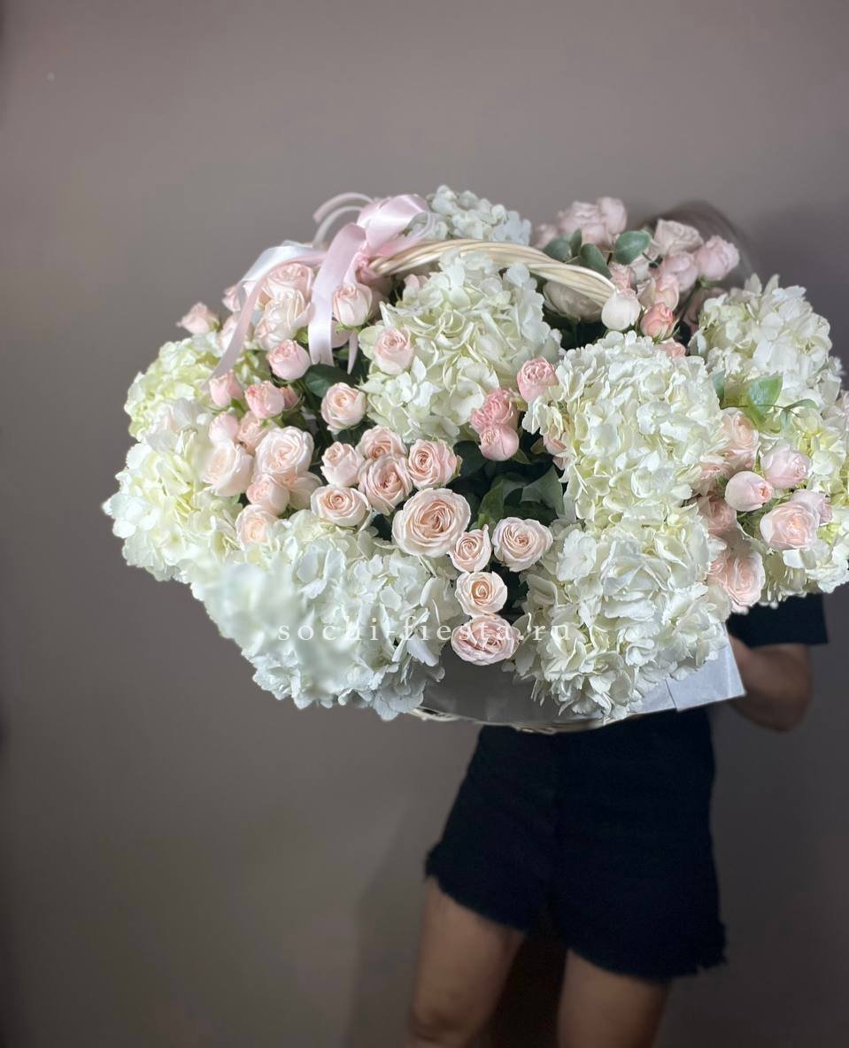 Плетёная корзина вмещает густую композицию из белых и розовых бутонов. Хризантемы и розы перемежаются с соцветиями гортензии, а статица добавляет воздушности между крупными головками цветов.
