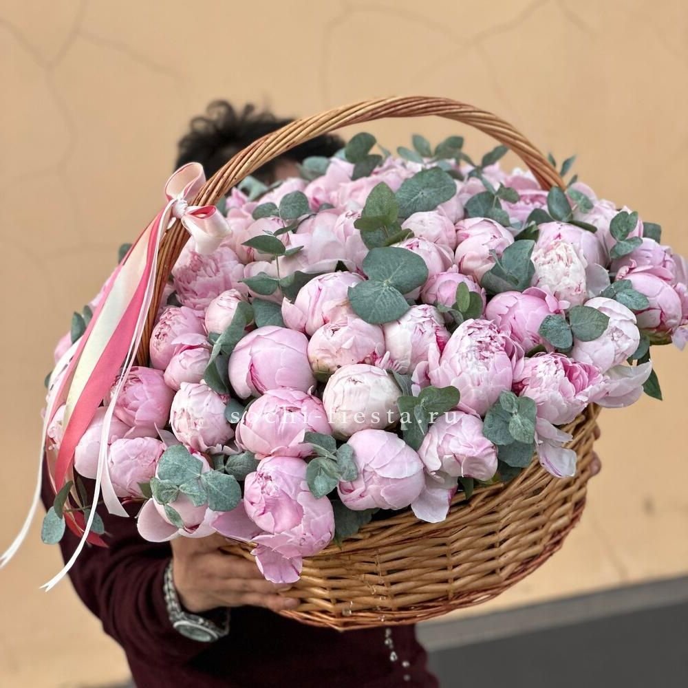 Семьдесят пять пионов сорта Сара Бернар создают пышное облако коралловых оттенков. Корзина наполнена крупными бутонами с лёгким обрамлением эвкалипта и занимает центральное место в любом интерьере.