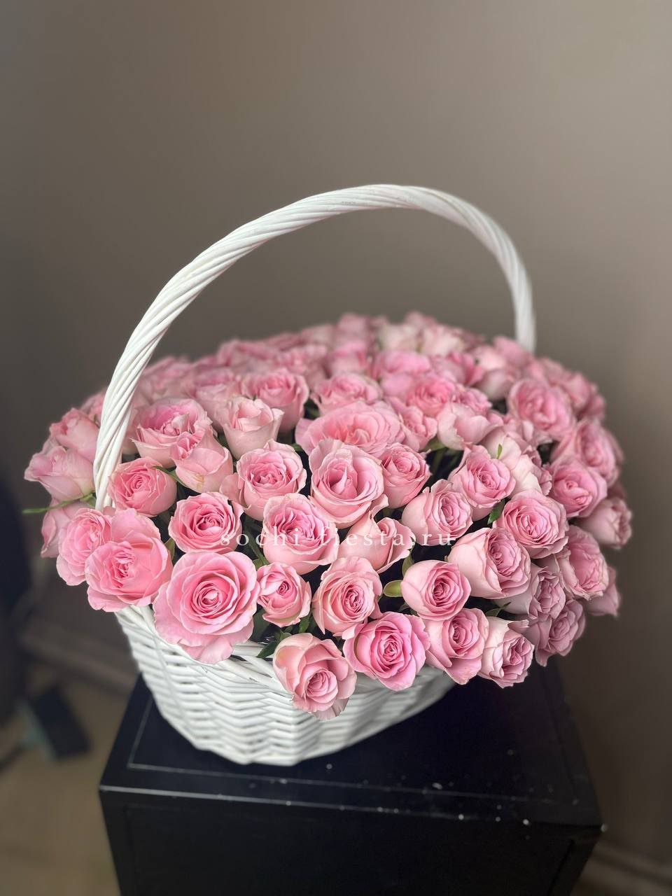 Сорок одна пионовидная роза в светлой корзине выстраивает объёмную композицию с мягкими переливами лилового и розового. Эвкалипт обрамляет густую россыпь бутонов.