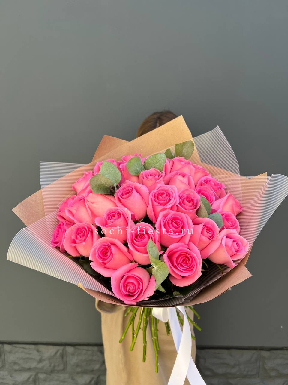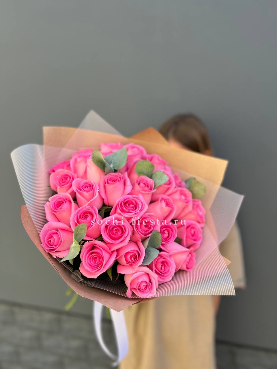 Бутоны Бомбастик распускаются крупными розетками и держат форму долго. Пятнадцать кустовых роз в крафте сохраняют свежесть и аккуратный силуэт.