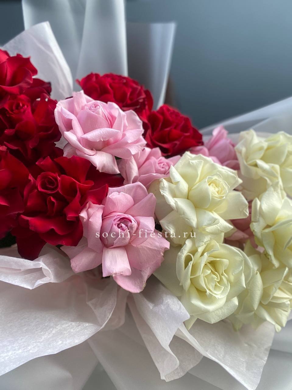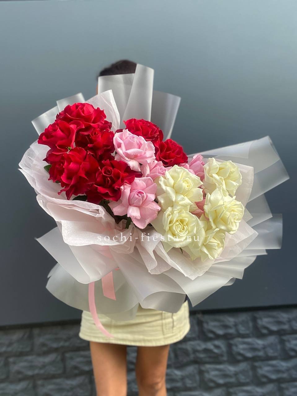 Розы Carousel радуют двухцветными лепестками с плавными переходами от кремового к малиновому краю. Пятнадцать бутонов собраны в аккуратную форму, которая долго сохраняет свежесть и яркость.