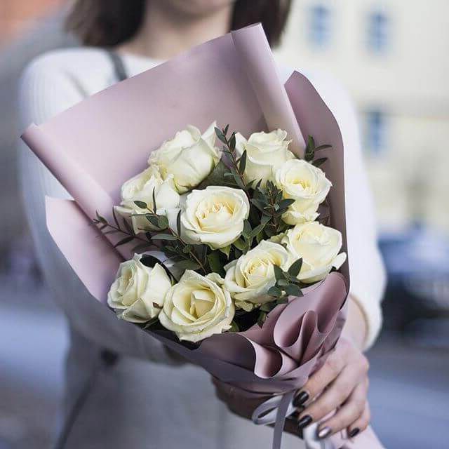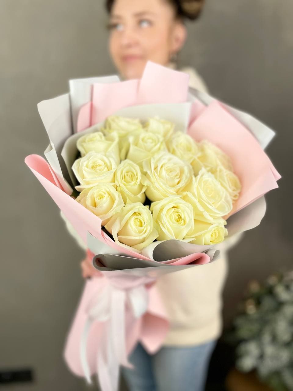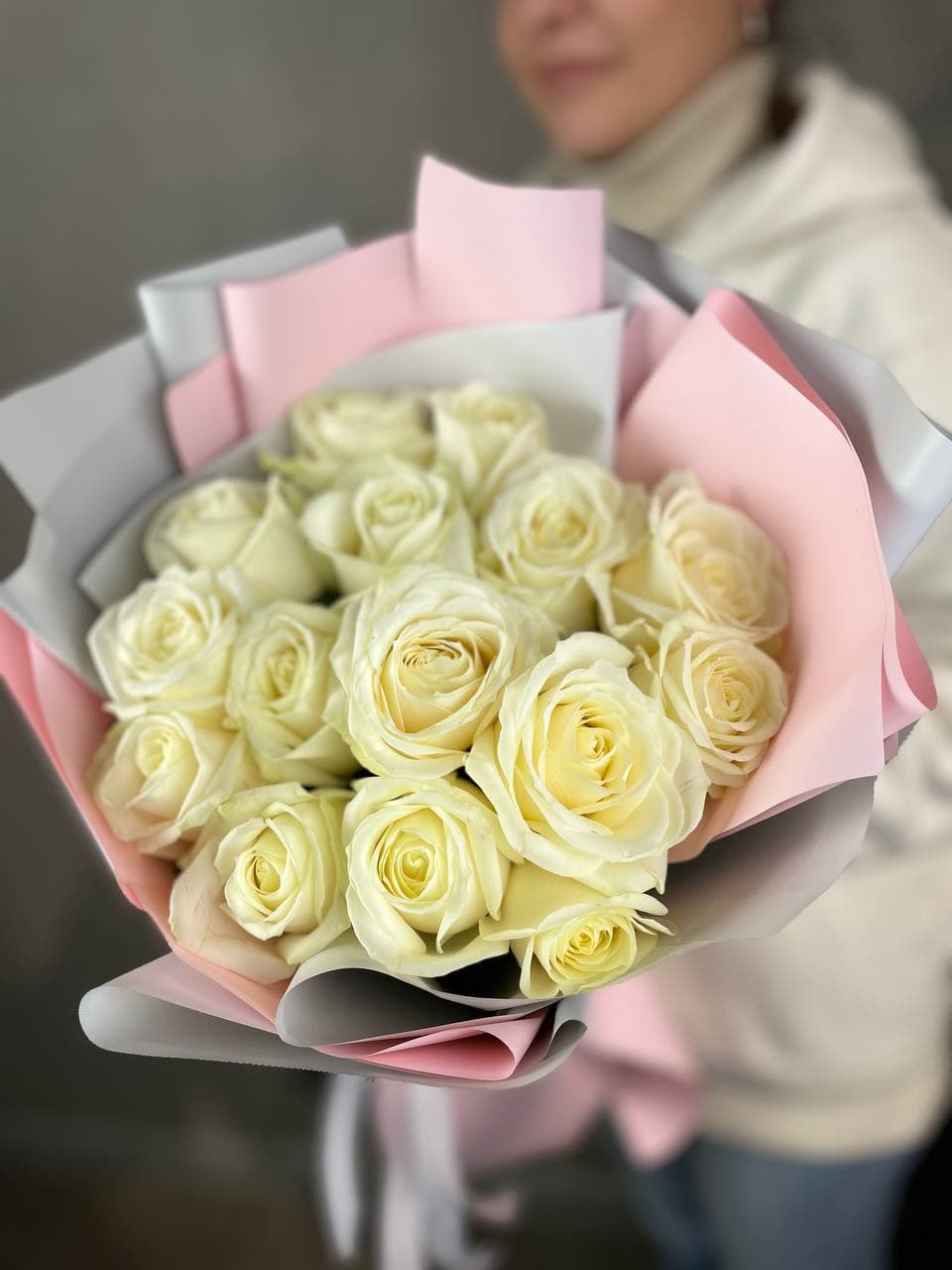 Пятнадцать белых роз в упаковке кофейного оттенка создают спокойное сочетание света и теплой глубины. Лаконичная форма букета удобна для вручения и дальнейшего размещения.
