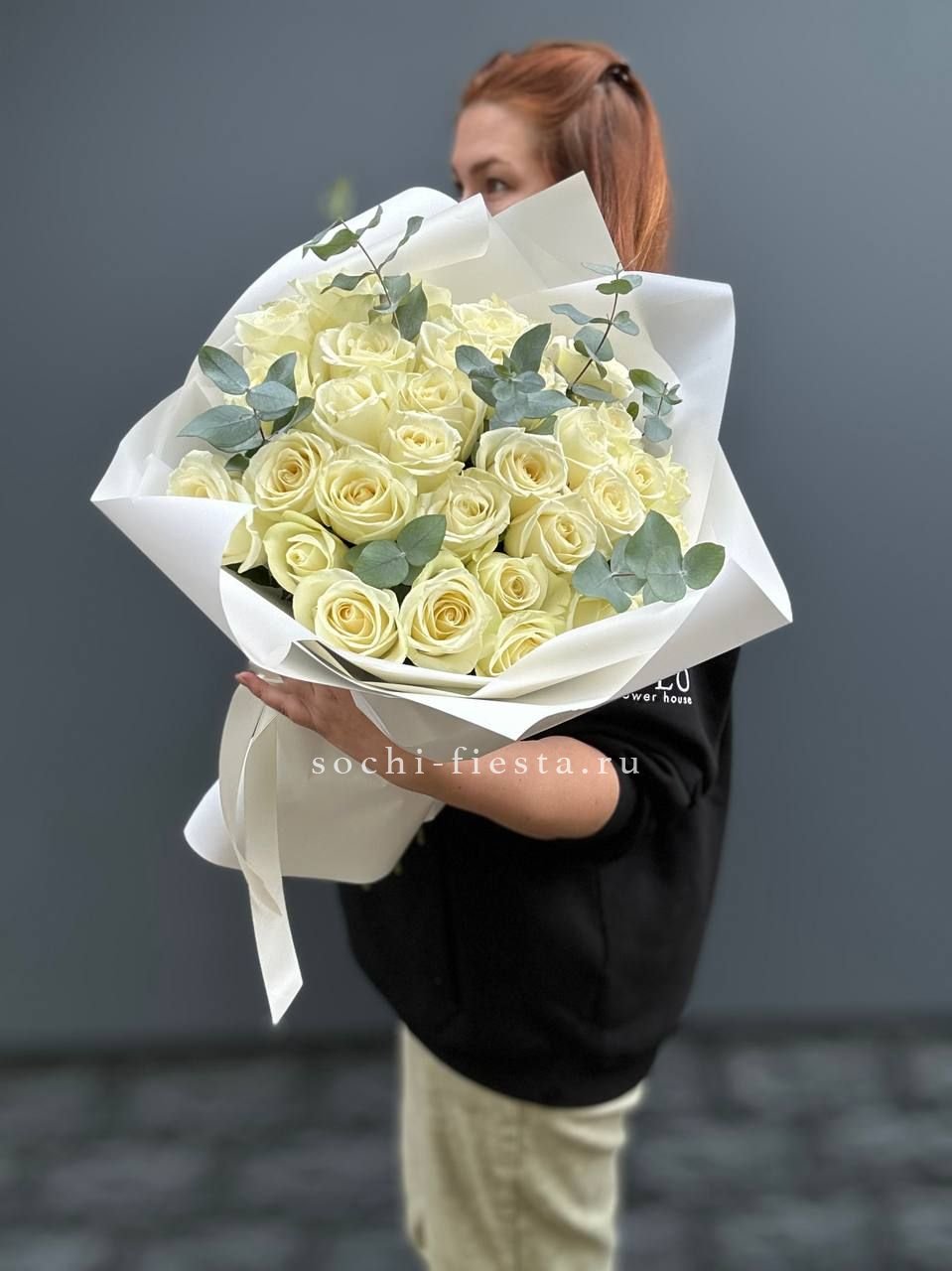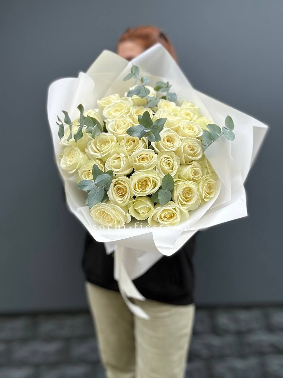 Девятнадцать белых роз в лаконичной крафтовой упаковке держат чёткий силуэт. Прямые стебли и плотные бутоны создают графичную композицию.