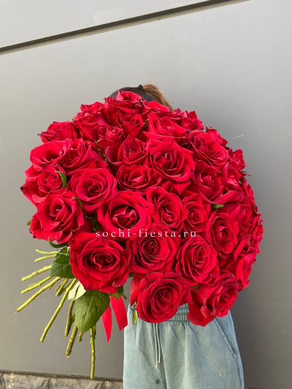 Сто один красный бутон дополнен ветками эвкалипта с серебристой листвой. Объёмная композиция занимает пространство и притягивает внимание своей масштабностью.