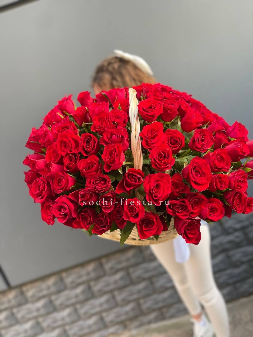 Плетёная корзина вмещает сто двадцать один бутон насыщенного алого оттенка. Композиция создаёт впечатление цветочного ковра с безупречной укладкой каждого стебля.