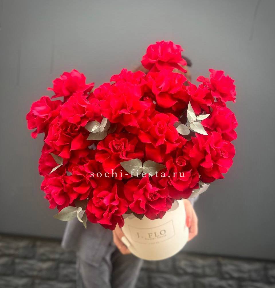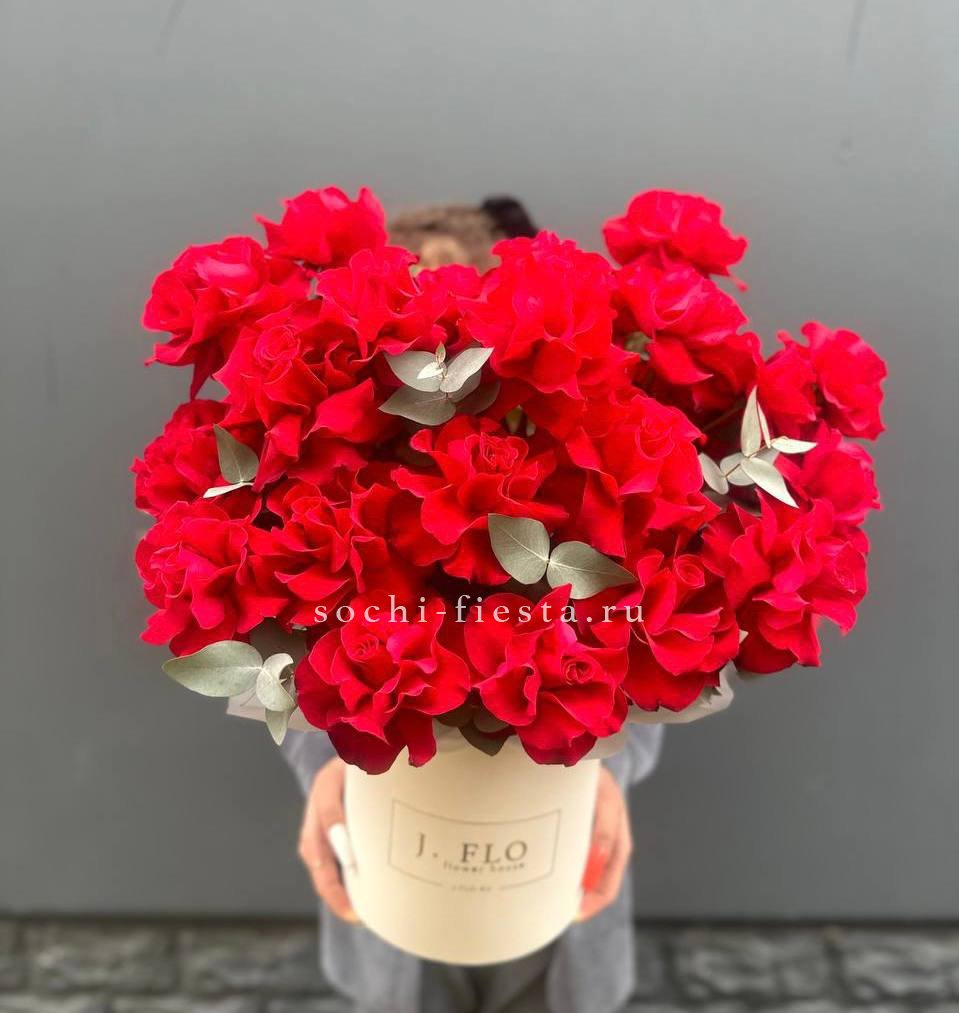 Тридцать пять бутонов с развернутыми лепестками создают насыщенное красное пятно в пространстве. Эвкалипт обрамляет композицию и добавляет воздуха между цветками.