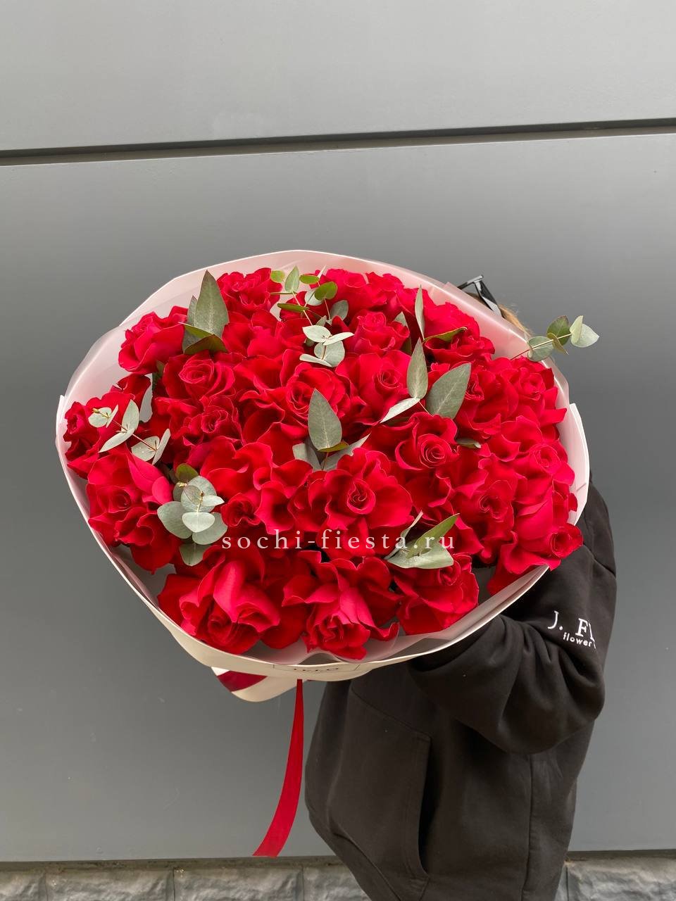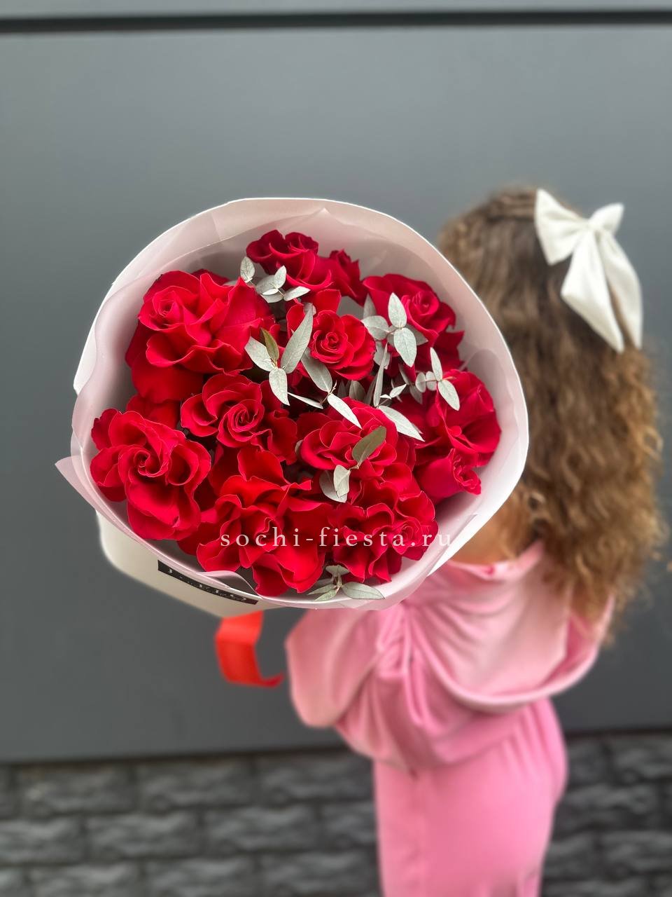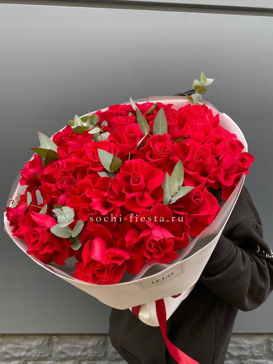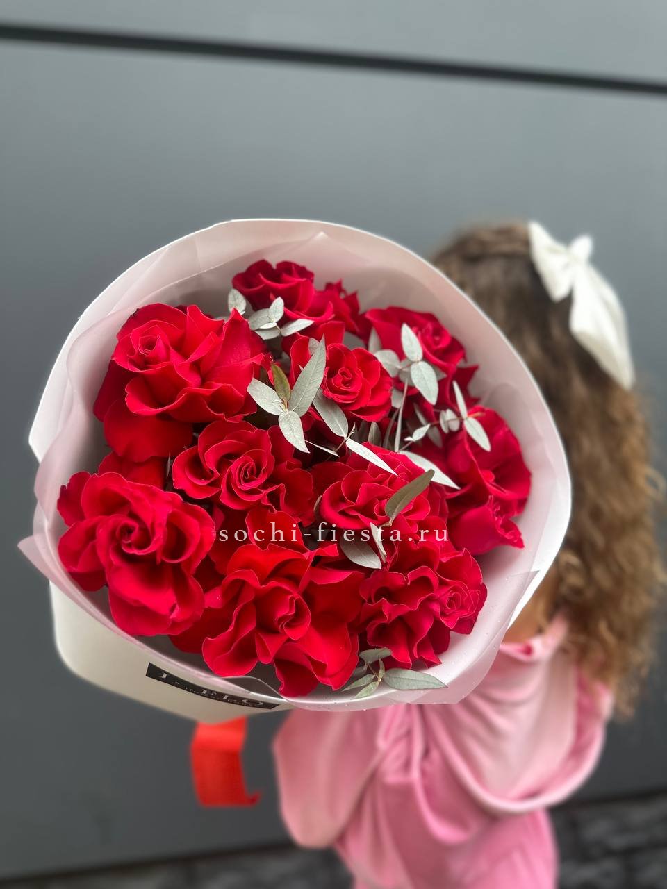 Семь французских роз с крупными бутонами и густой фактурой лепестков. Красный цвет звучит насыщенно и глубоко, а эвкалипт добавляет свежести композиции.