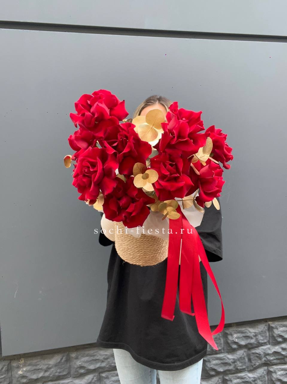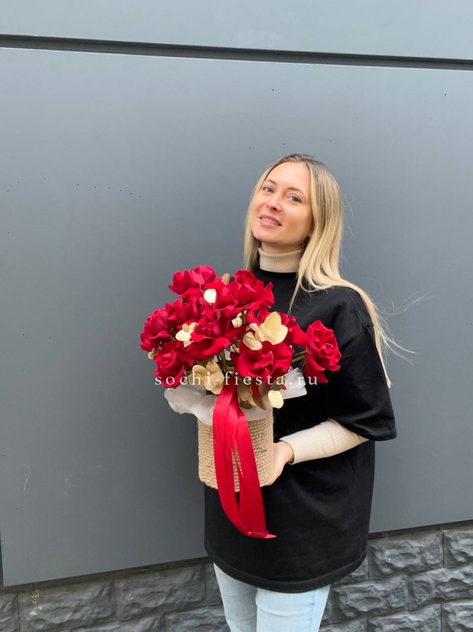 Двадцать девять роз сорта Аликанте с длинными стеблями образуют впечатляющую вертикальную композицию. Глубокий красный оттенок и крупные бутоны создают выразительное присутствие в любом пространстве.